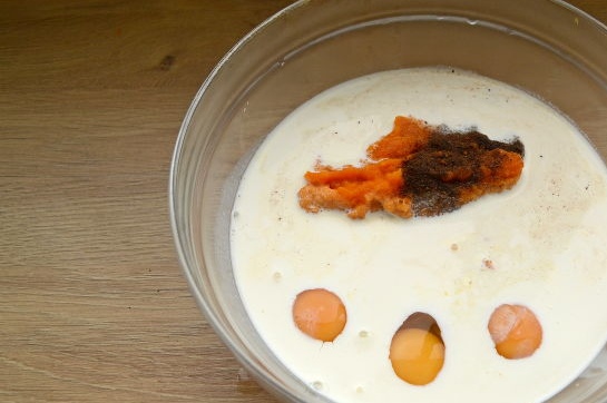 В тыквенное пюре выложите 3 яйца и оставшийся белок, сахар (можете добавить больше, если вам кажется, что его недостаточно), кленовый сироп, сливки, пряности и соль.