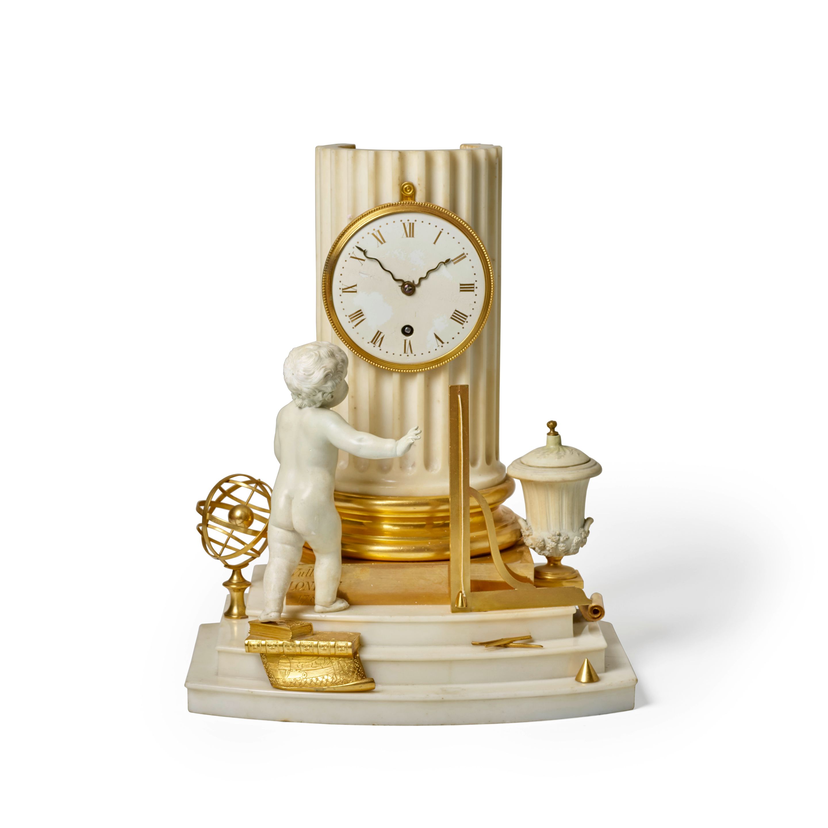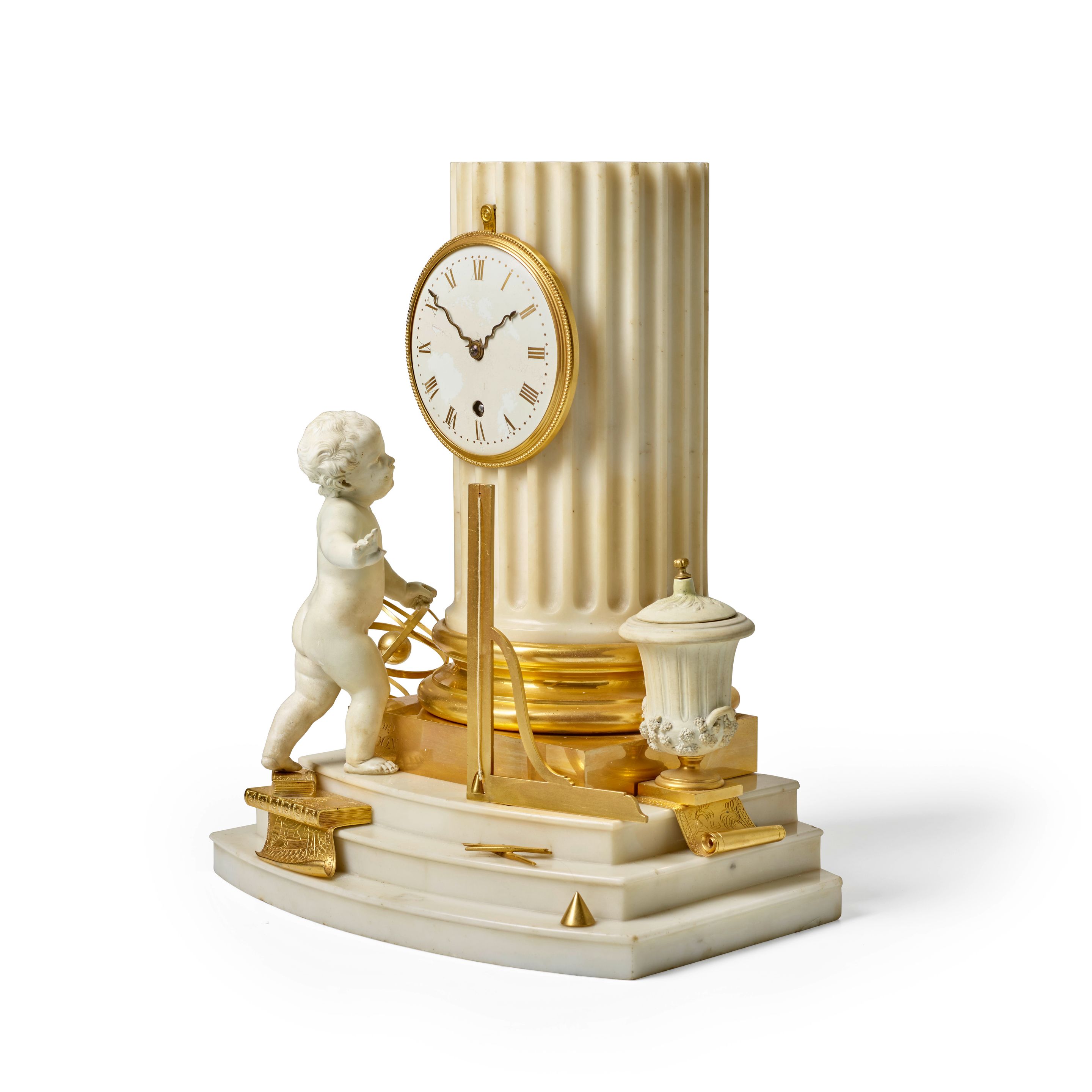 A GEORGE III ORMOLU-MOUNTED WHITE MARBLE AND DERBY BISCUIT PORCELAIN MANTEL TIMEPIECE