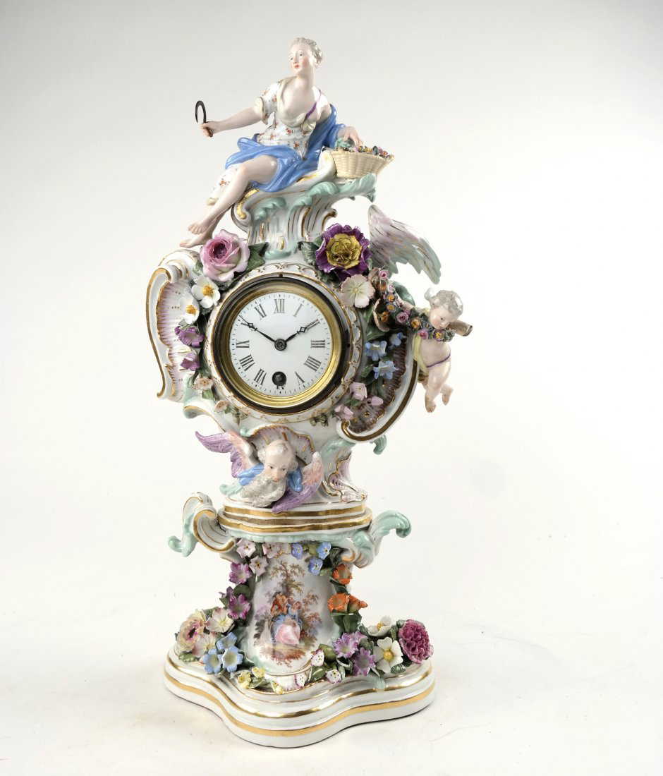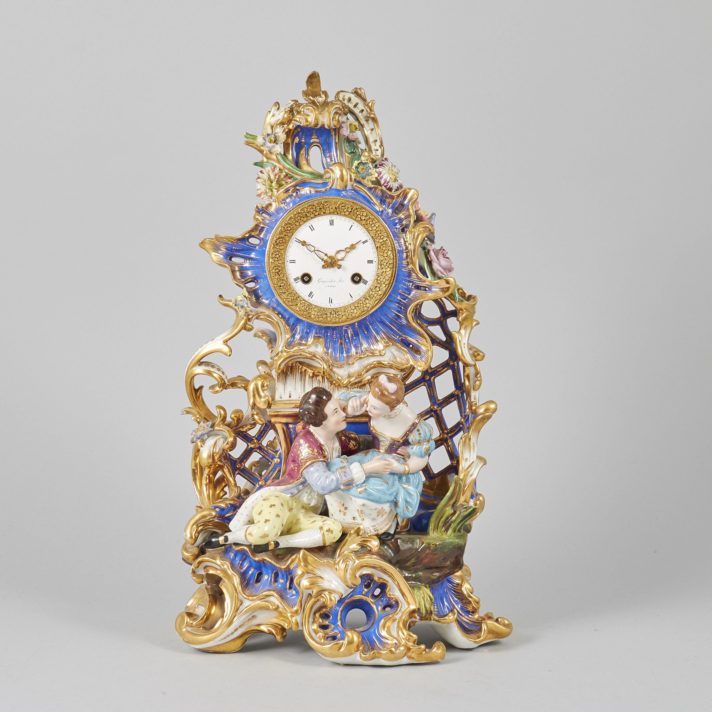 A Louis XV ormolu and porcelain mantel clock, circa 1750 with later associated movement and dial circa 1785