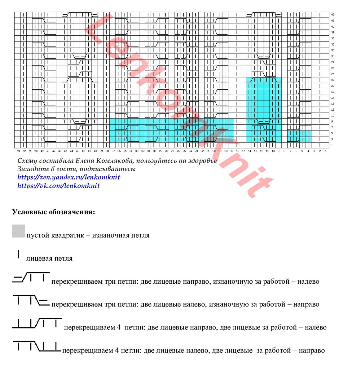 Схема узора - на картинке. В программе немного не хватило петель, слева вяжем такую же косу, которая в начале схемы - справа. Оранжевым цветом отмечены две центральные петли, это центральная часть переда и спинки свитера.