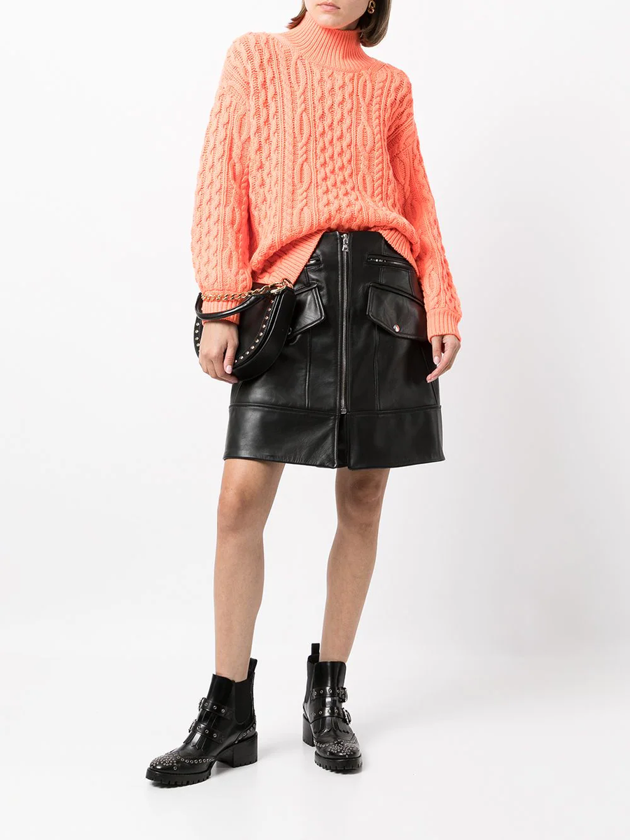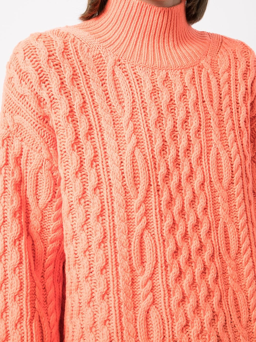Свитер с обилием кос и переплетений связан из нетолстой пряжи красивого кораллового цвета. Выкройка у этого свитера самая типичная - спущенное плечо, ворот - стойка.