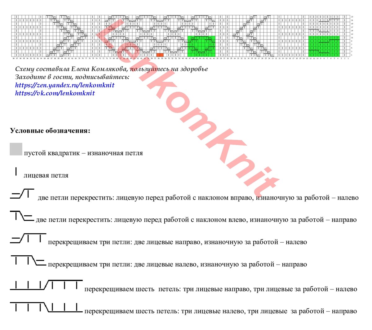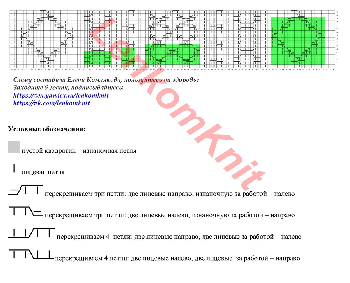 Схема вязания свитера составлена для лицевых рядов. Зеленым цветом отмечены рапорты разных узоров.