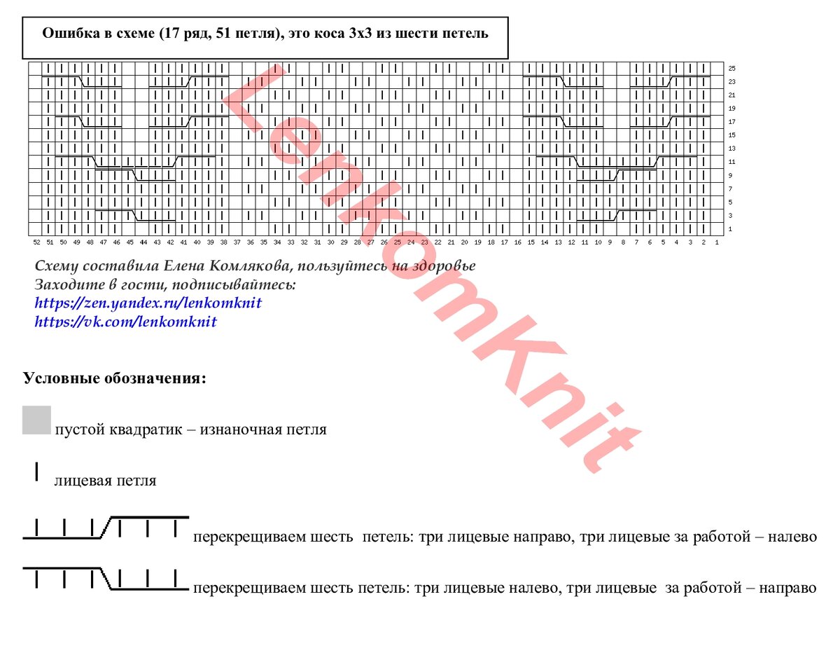 Схема узора (с небольшой ошибкой, немного не прорисована левая коса в 17 ряду, но заметила это уже поздно). Узор справа и слева от центральной "шахматки" повторяется по три раза справа и слева. Переплетения кос правой и левой части сделаны в зеркальном отражении.