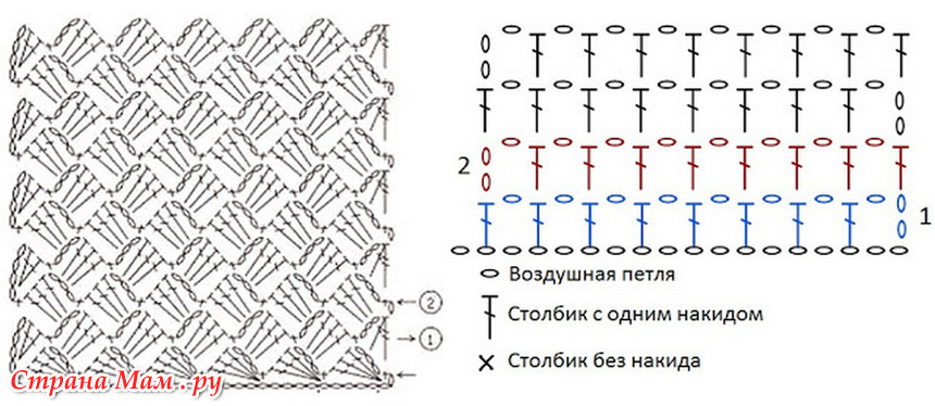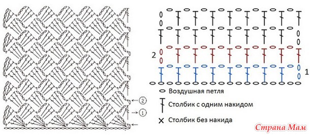 Первый узор, это сеточка. Схема состоит из 1-го столбика с накидом и воздушной петли.