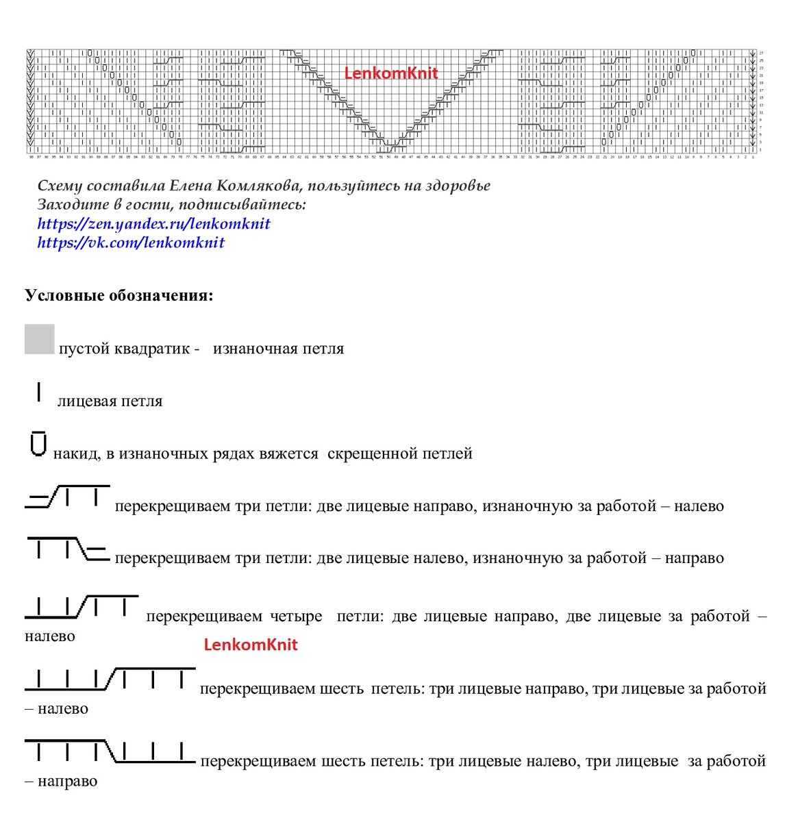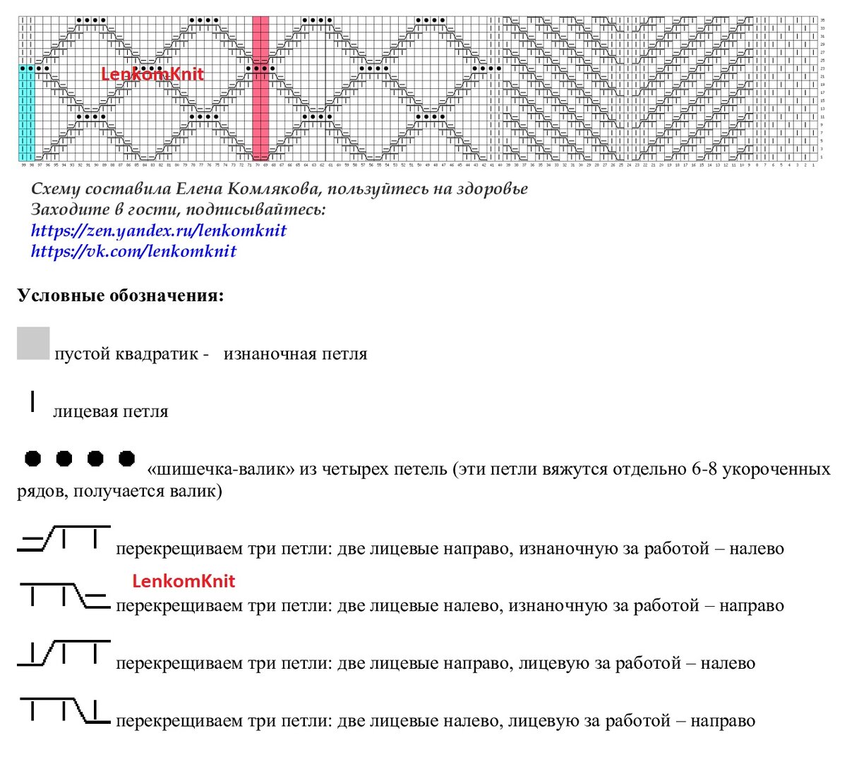 Вторая схема - для спинки топа, тут тоже 98 петель (лицевые ряды). Основной вид узоров тут - жгуты из четырех петель, которые перекрещиваются в каждом шестом ряду.
