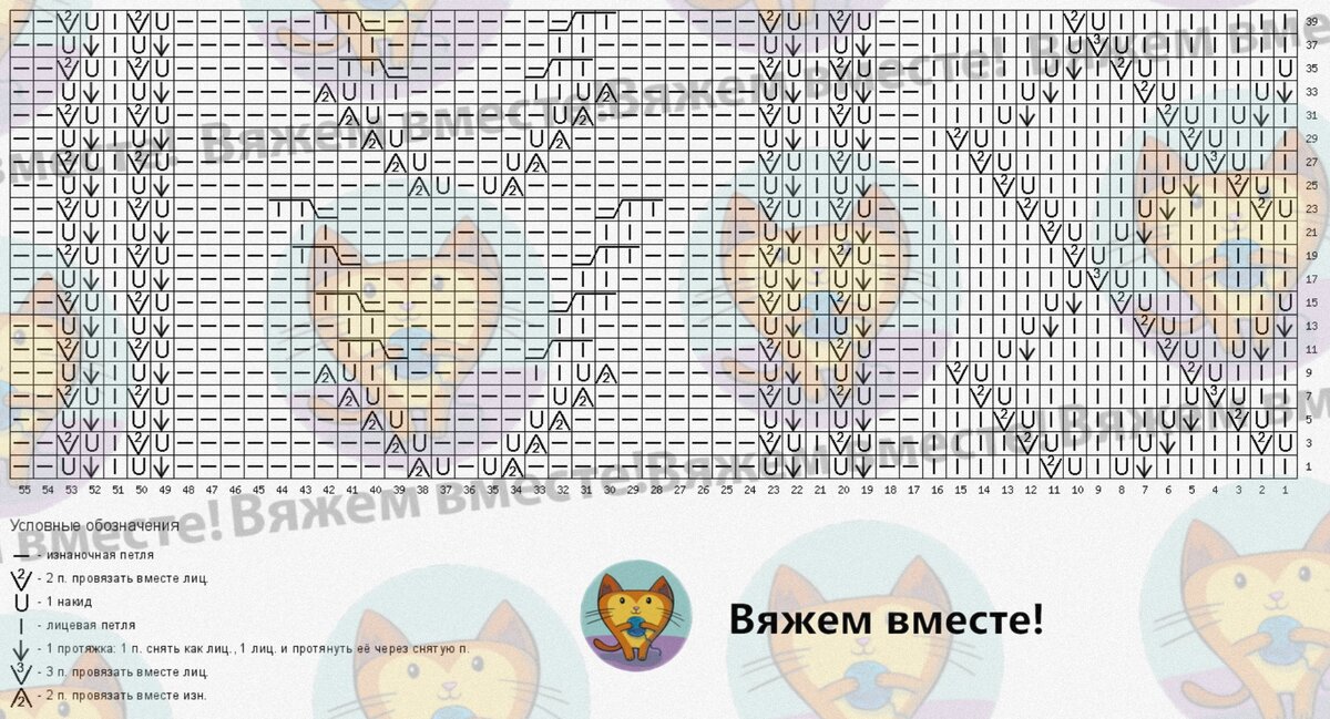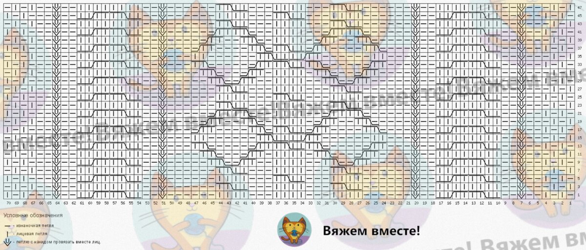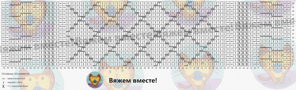 Обратите внимание, то на схеме даны только лицевые ряды вязания, изнаночные вяжутся так, как петли лежат на спице.
