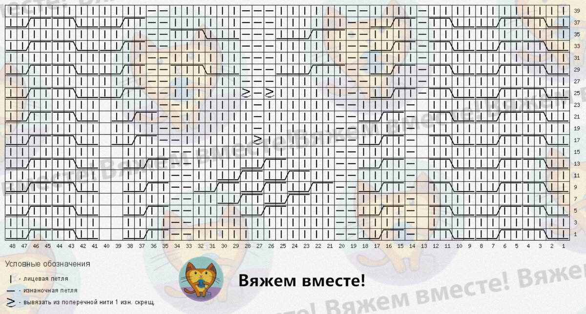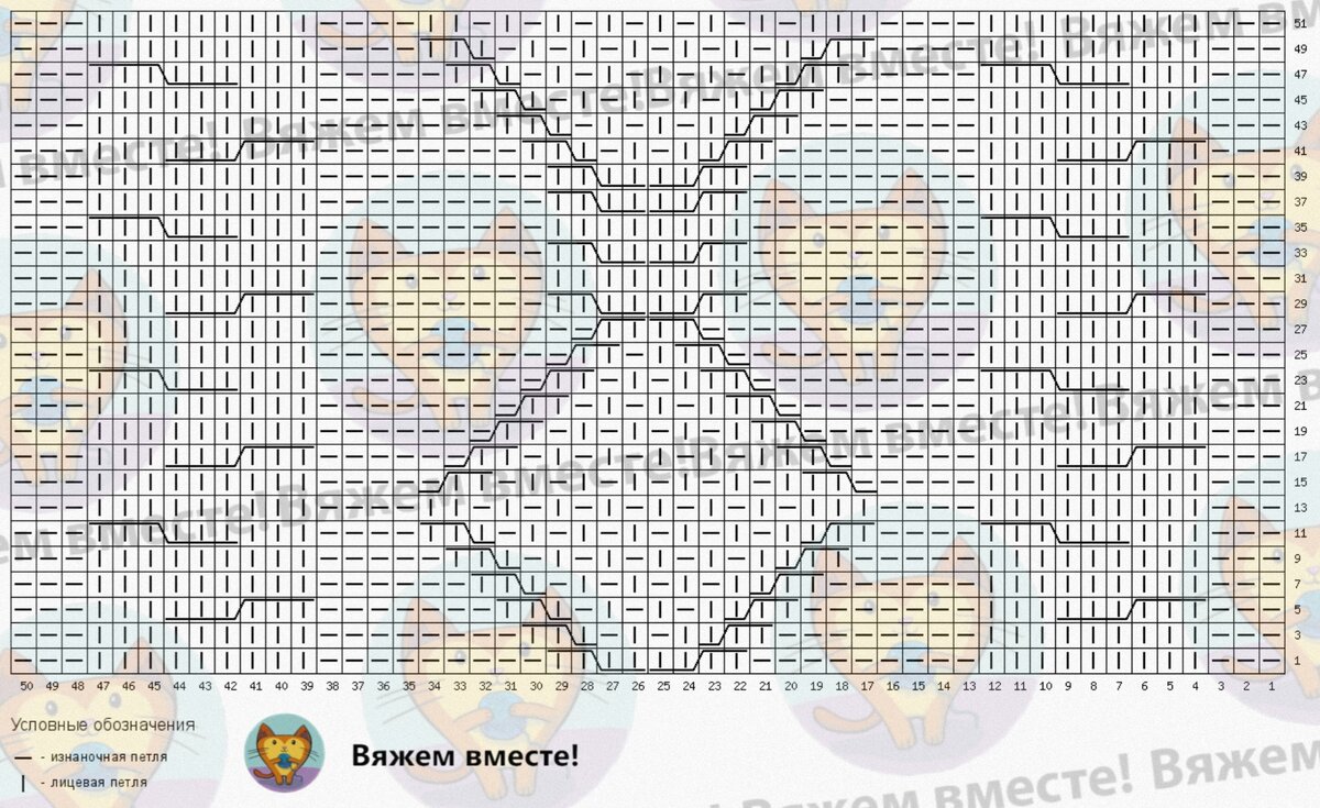 Раппорт узора равен 40 рядам по высоте и 50 петлям по ширине полотна. Чётные ряды вяжутся по рисунку петель на спице.
