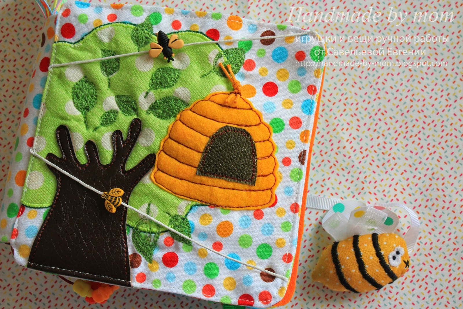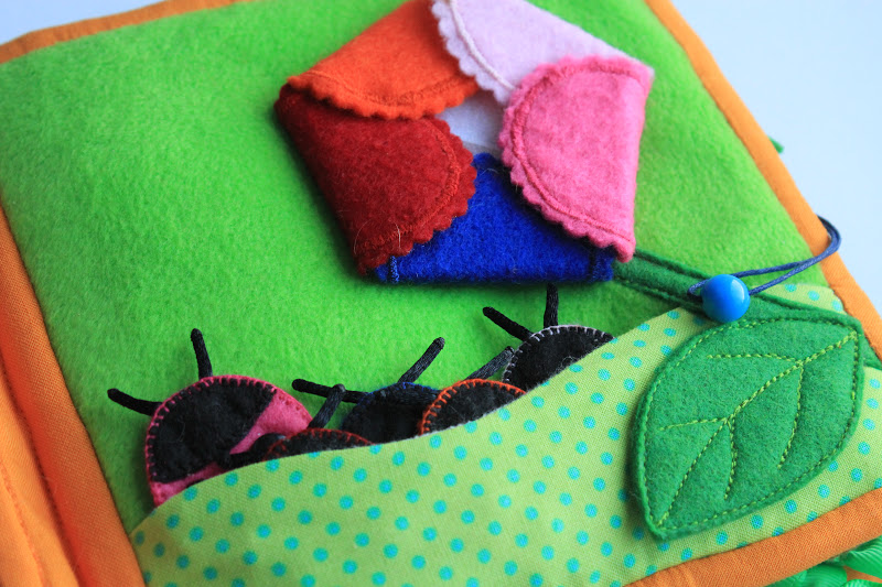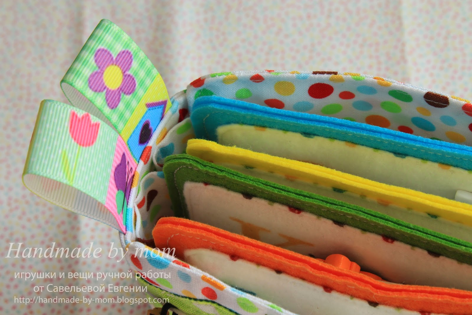 В книжечке есть: шуршащие элементы, липучка, магниты, разнофактурные ткани (иск. кожа, фетр, хлопок, фланель, плотная пленка, ворсистая ткань, сеточка), пищалка, колокольчик, гремелка, различные шнурочки и ленточки, фигурные пуговицы, деревянные фигурные бусины и пластиковые...)