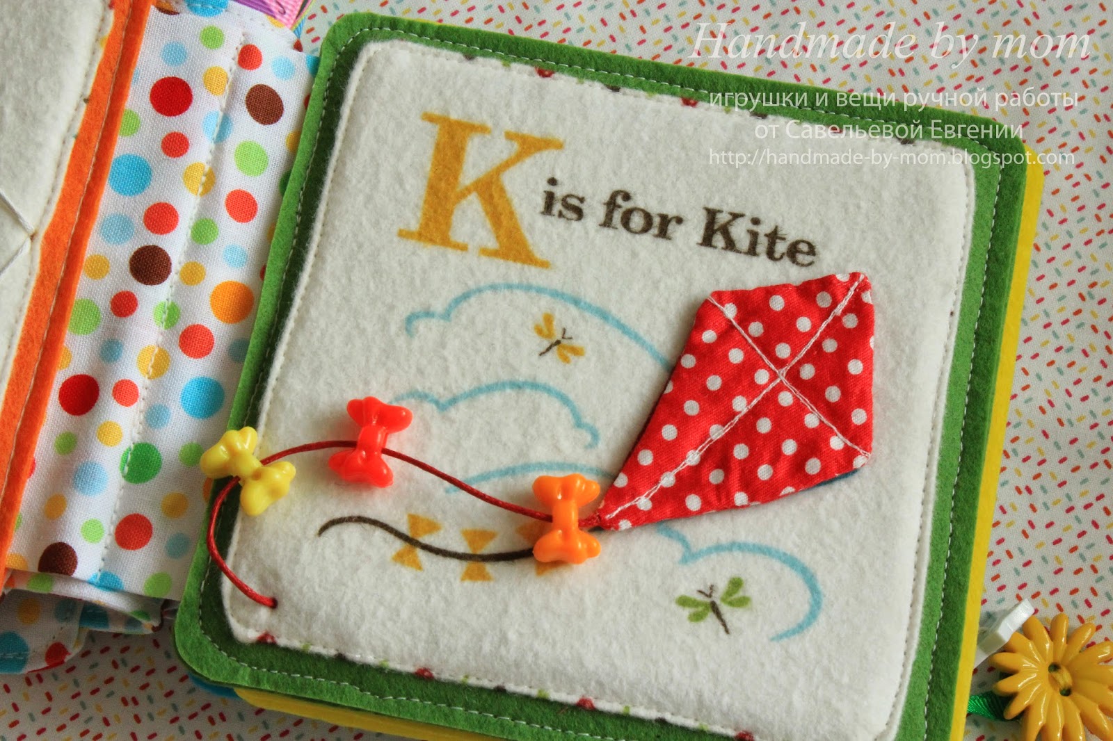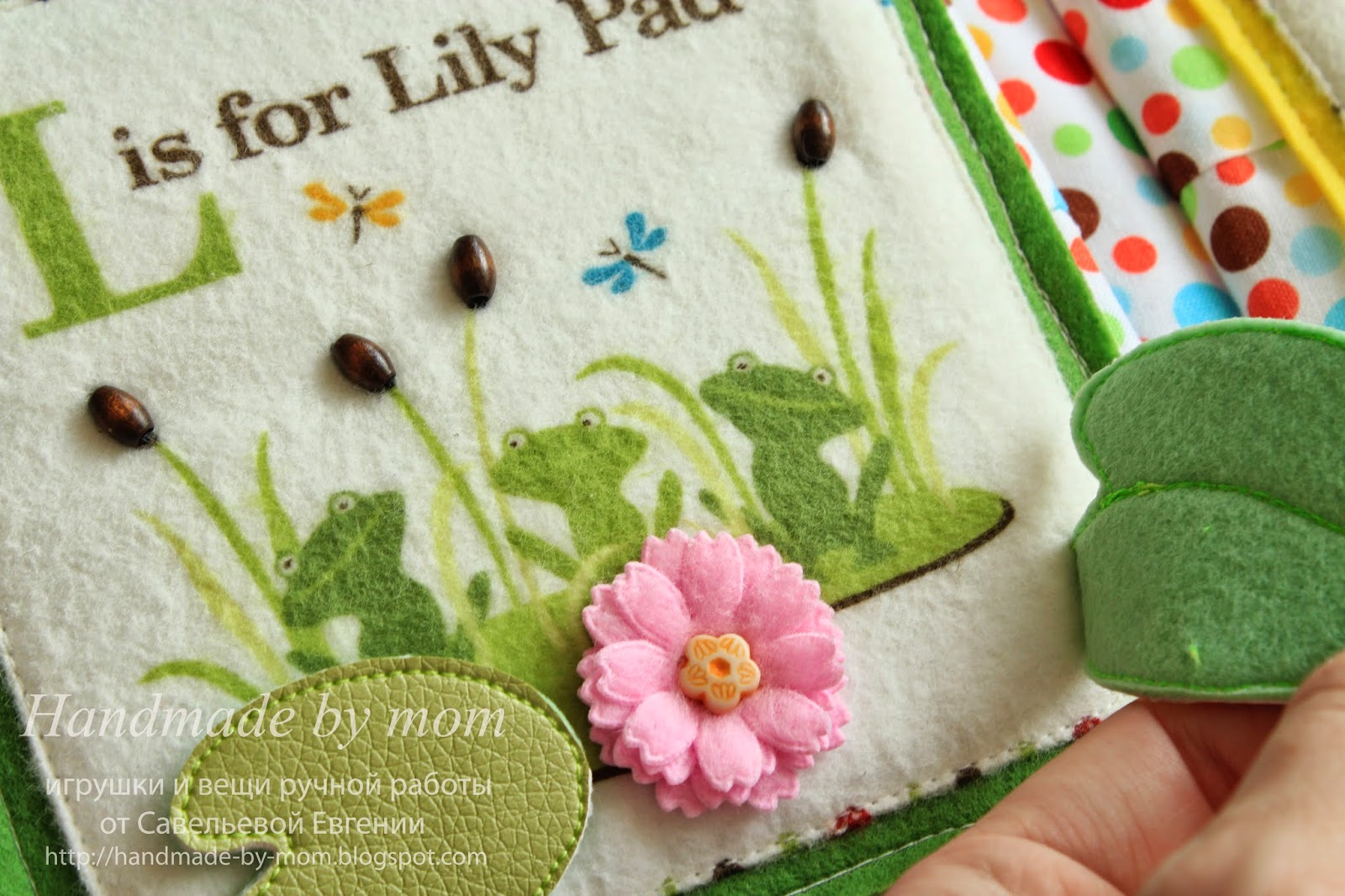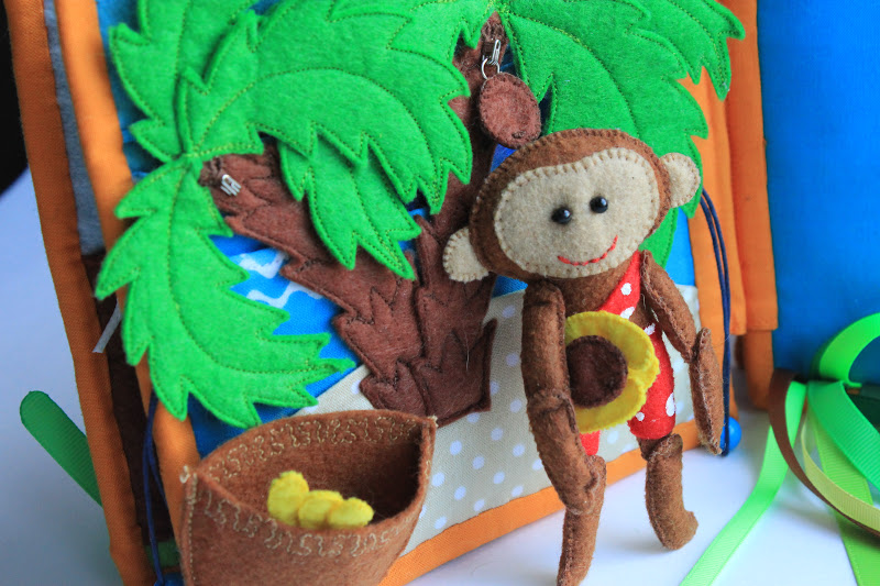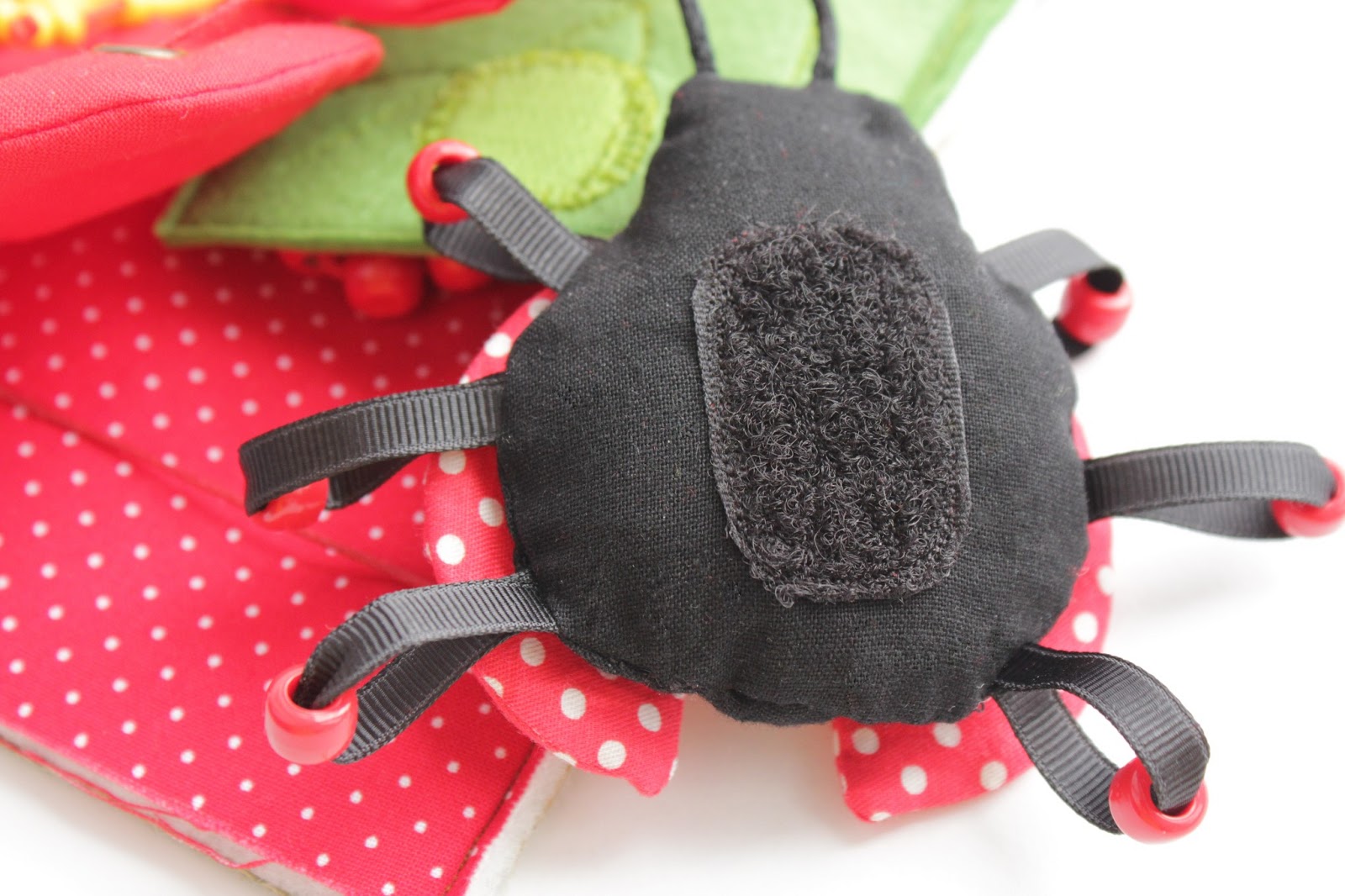 В книжечке есть: шуршащие элементы, липучка, магниты, разнофактурные ткани (иск. кожа, фетр, хлопок, фланель, плотная пленка, ворсистая ткань, сеточка), пищалка, колокольчик, гремелка, различные шнурочки и ленточки, фигурные пуговицы, деревянные фигурные бусины и пластиковые...)