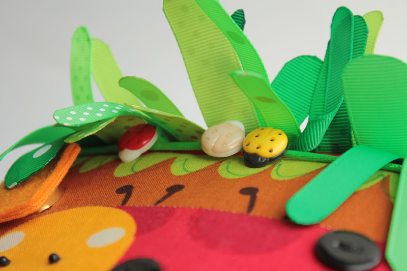 обложки поближе... Травка из репсовой ленты разной, с обработанными концами, чтоб не обсыпалась, пуговки-точки на бабке коробке + глазки бусинки для дополнительных тактильных ощущений....Застежку на этот раз сделала двойную, чтобы личико у бабки коробки не закрывать...)))