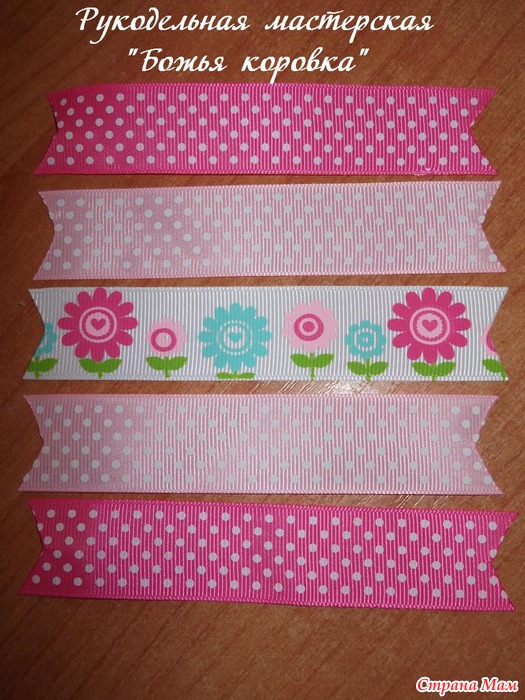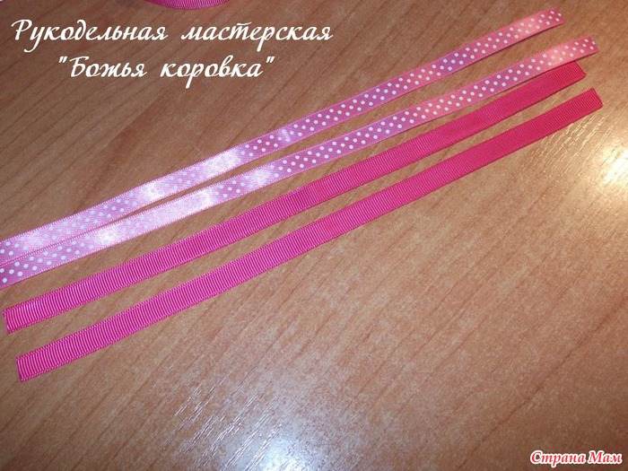 нарезаем отрезки репсовой ленты шириной 22-25 мм. и длиной 12 см. - у меня 5, можно взять больше, но по моему опыту получается слишком толсто и неудобно потом при сборке. Если взять атласные ленты, то будет нормально.