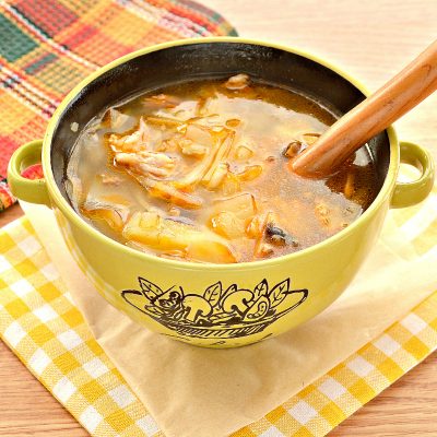 Для начала отварим мясной бульон из свинины (можно использовать мясо на кости). В щах присутствует капуста, картофель, морковь, лук, свежие грибы – шампиньоны, специи. Подробности приготовления в нашем рецепте.