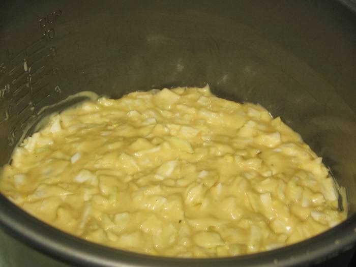 Вылить в кастрюлю мультиварки, заранее смазанную сливочным маслом.