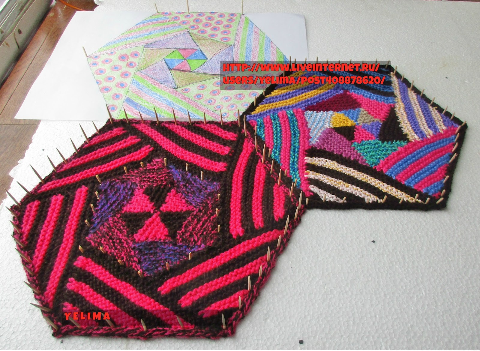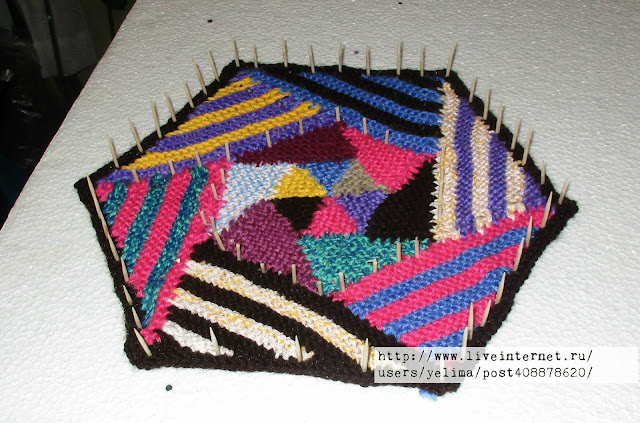 Этот шестигранник вяжется из маленьких остатков пряжи, на мой взгляд, слишком уж шокирующе ярки и бросско получилось. Хотя я люблю яркое.