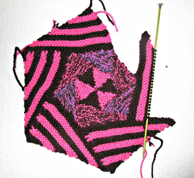 было 2 волокна алого+ 2 волокна коричневого. Выдернула одну коричневую нить и добавила вместо неё фиолетовую А потом чередовала треугольники: один цветом коричнево-алым, а другой с добавлением ''чужого'' цвета. Треугольники снова проявились, но уже в теневом варианте. Так понравилось больше.