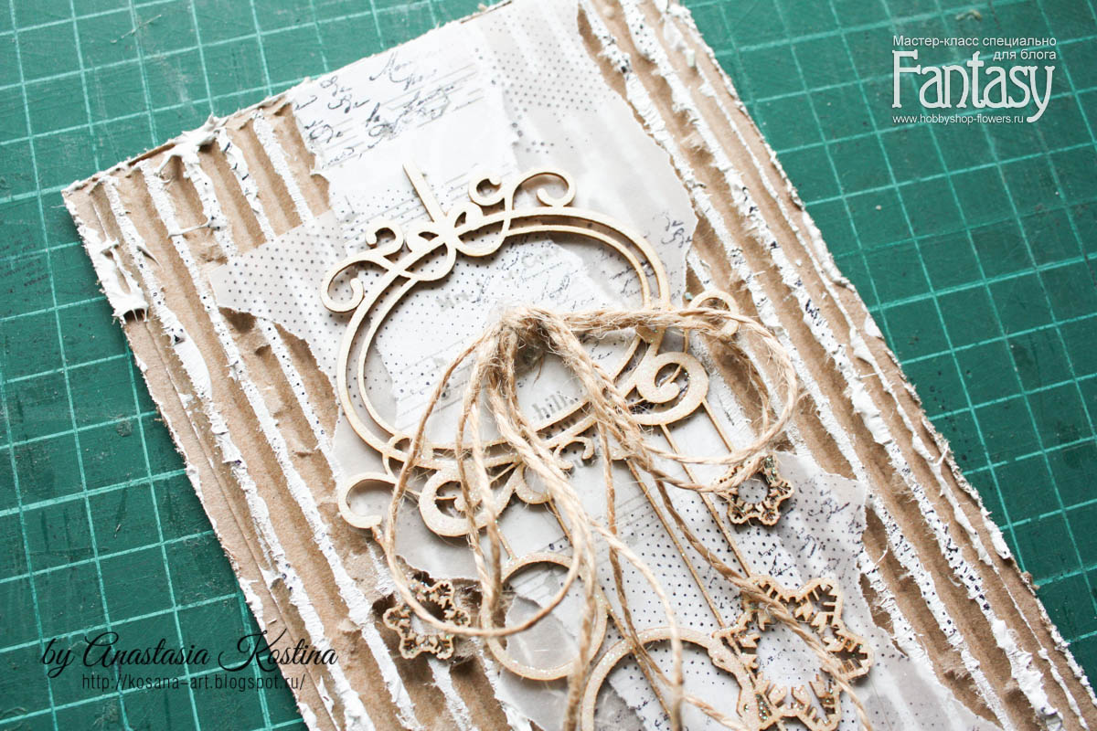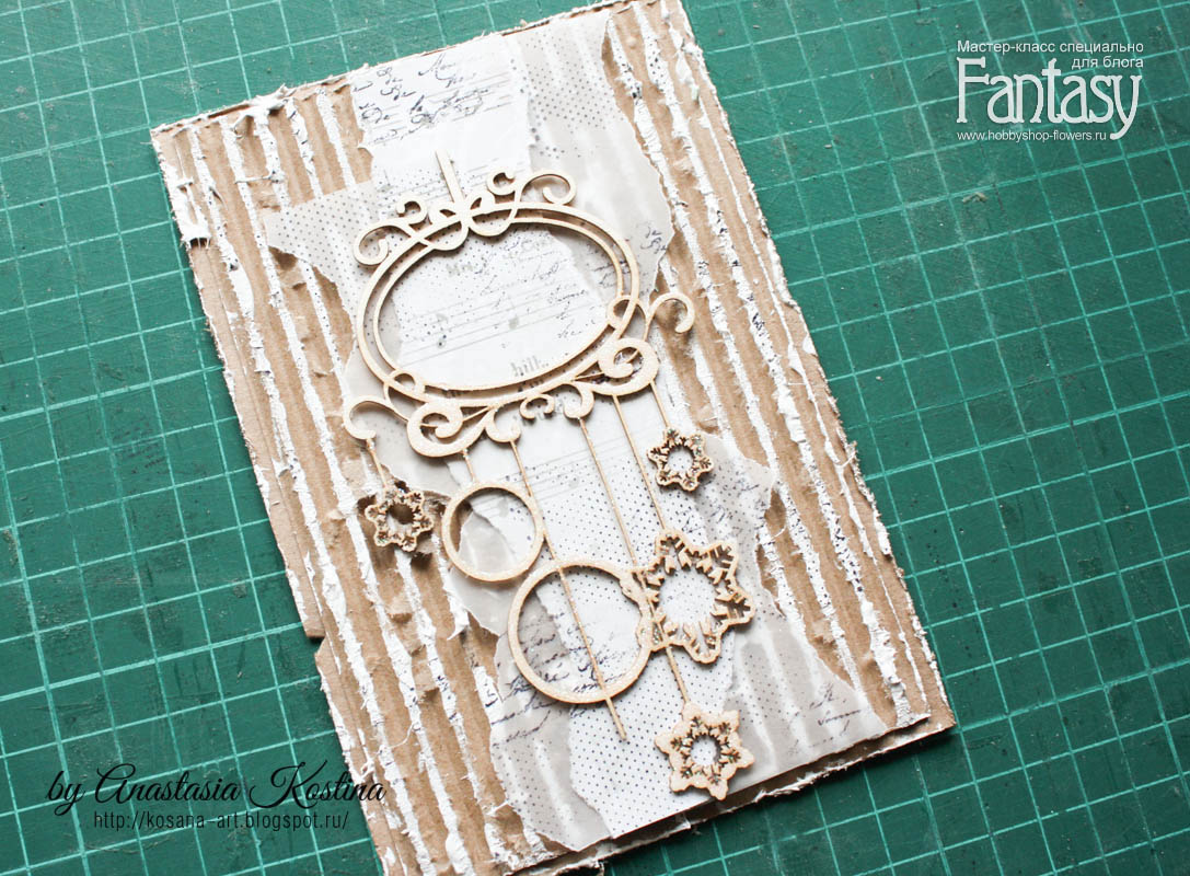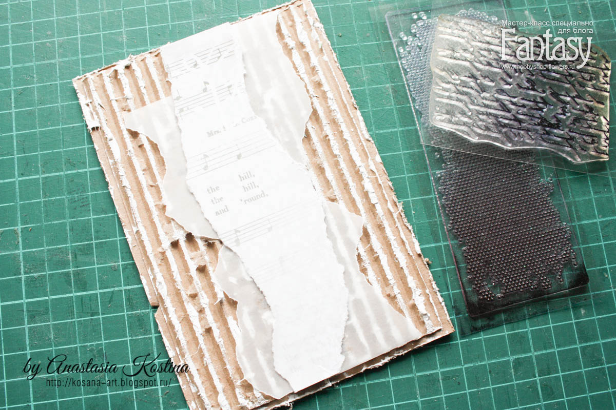 Берем обычный упаковочный картон, вырезаем нужный нам формат и сдираем верхний слой до появления "рифленой" структуры. В качестве основы для открыточки я использовала краф-картон.