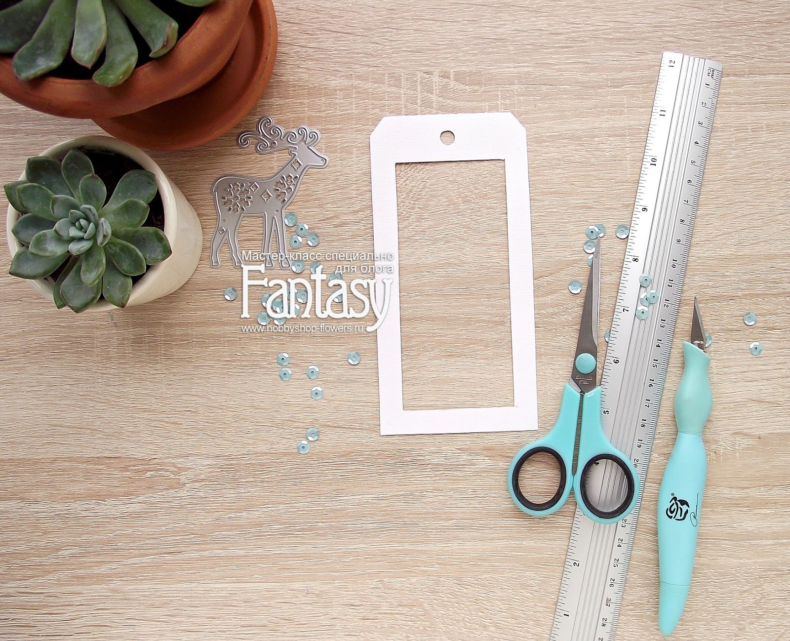 Внутри вырежем прямоугольник 5,5х12 см. Получим вот такое окошко. Это будет основа тега. Ее пока отложим в сторону и займемся основной частью.