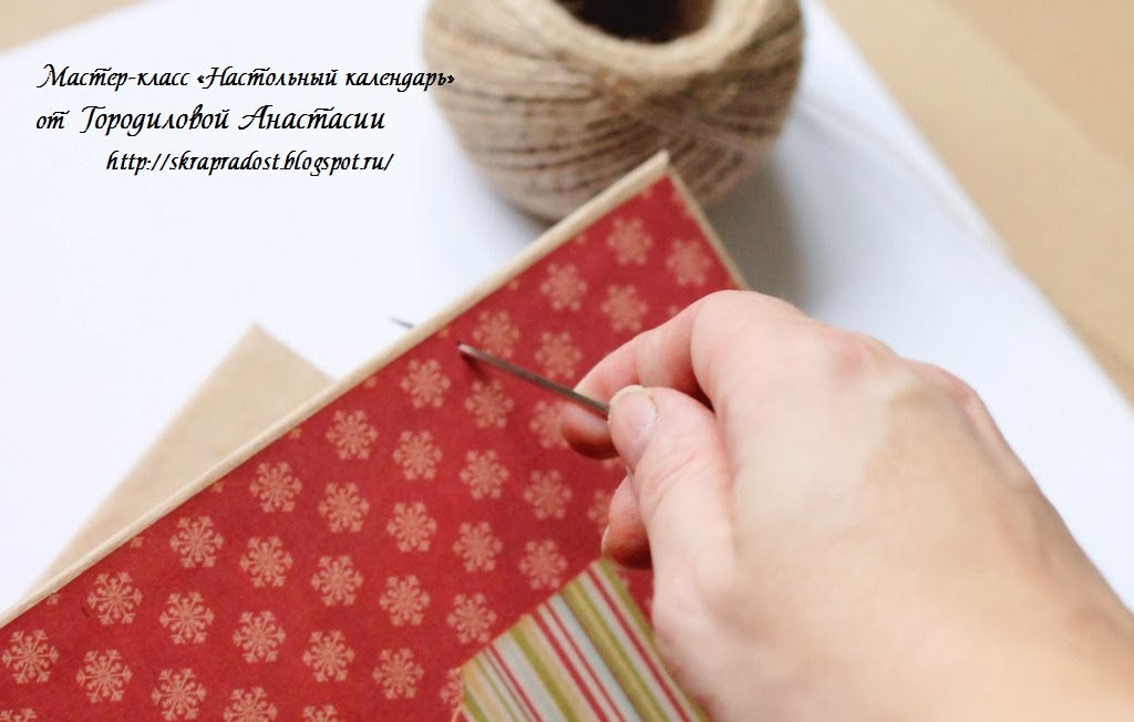 Теперь можно приклеить и ее к оставшейся части заготовки, а затем проделываем дырки в верхней части календаря толстой иглой и продеваем бечевку. Делаем это в двух местах, равных по расстоянию от края.