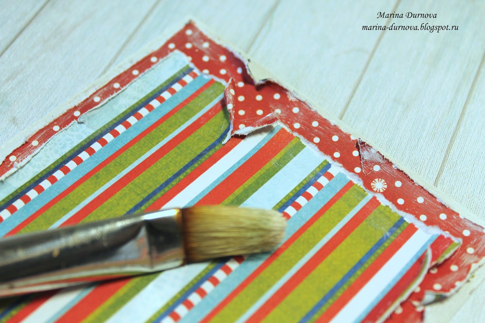 2. К переплетному картону приклеиваем один на другой листы скрап бумаги. Концы бумаги не приклеиваем, а наоборот приподнимаем их пальцами и загибаем в некоторых местах, усиливая эффект состаривания. Полусухой кисточкой наносим белый акрил на края скрап бумаги (слегка). Этот прием создаст эффект "заснеженности" нашего календарика.