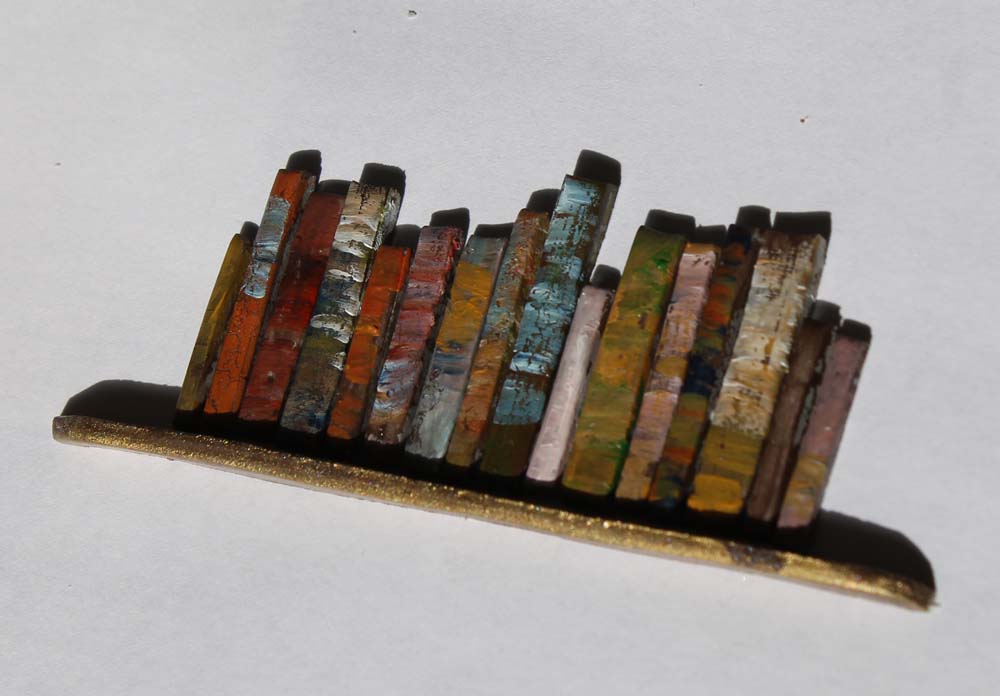 Раскатываем продолговатую лепешку из глины (примерно 10х5см и толщ. около 2мм), обрезаем нижний край и нарезаем разной толщины полосочки (книжки).