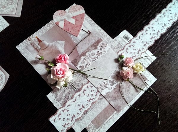 Далее, начинаем "собирать" открытку. Я всегда придерживаюсь правила треугольника - композиция идет треугольником или по диагонали. В данном случае у нас треугольник: тег - платье - сердце. Чтобы элементы не летали в воздухе - их лучше сажать на горизонталь - в данном случае в качестве горизонтали у нас выступает элемент из листа "Декор", имитирующей кружево.