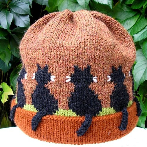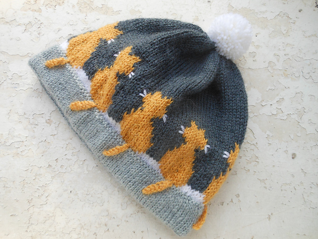 Глядя на эти шапочки,сразу поднимается настроение. Француженка Christine de Savoie придумала вот такие смешные шапки с кошками. Обыкновенный жаккард спицами, но изюминка в хвостиках. Если развивать эту тему,то можно так связать любых зверюшек в жаккардовой технике и придумать интересные детали к ним.