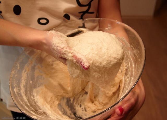 Помешиваем, чтобы сухие ингредиенты растворились в воде. Всыпаем муку, замешиваем некрутое тесто.