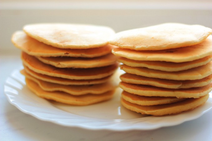 После чего добавьте муку, крахмал и разрыхлитель. Аккуратно все вымешайте и добавьте растительное масло. Выпекайте на хорошо разогретой антипригарной сковороде без масла 1 минуту с каждой стороны. Готовые блинчики подают с кусочком сливочного масла и соусом по вкусу.