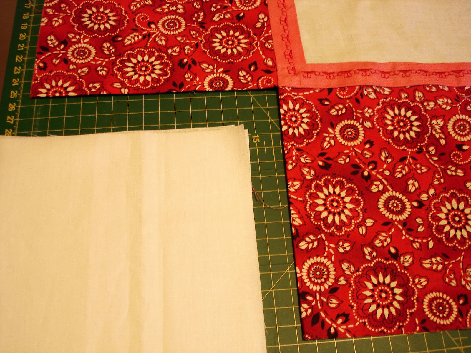 Пришиваем бордюр, сначала ко всем четырем сторонам красные прямоугольники нужных размеров, затем вырезаем 4 белых квадрата.