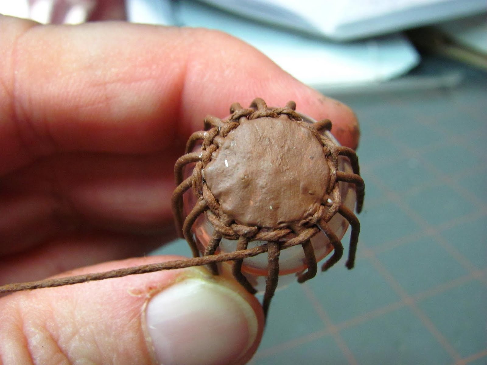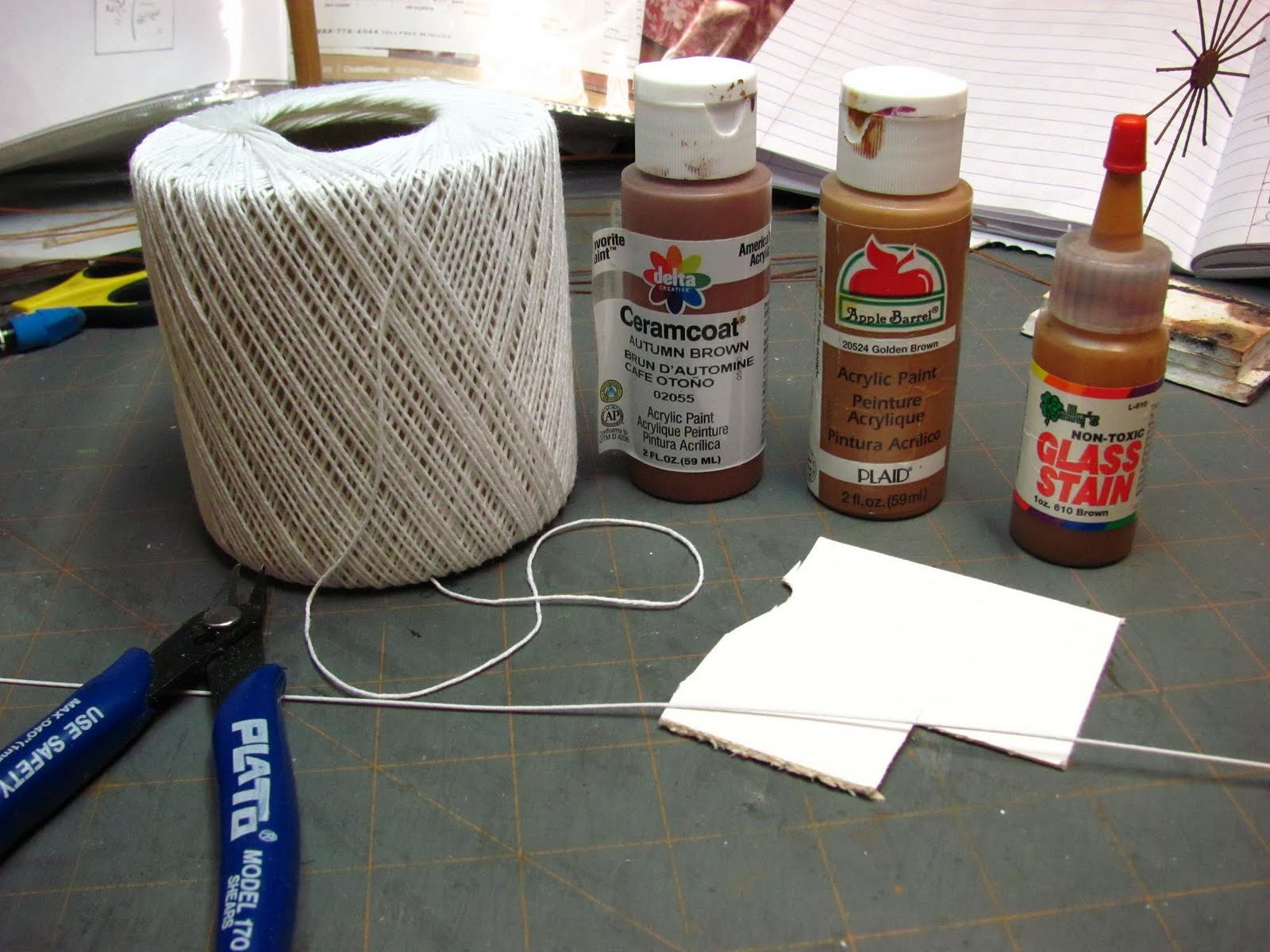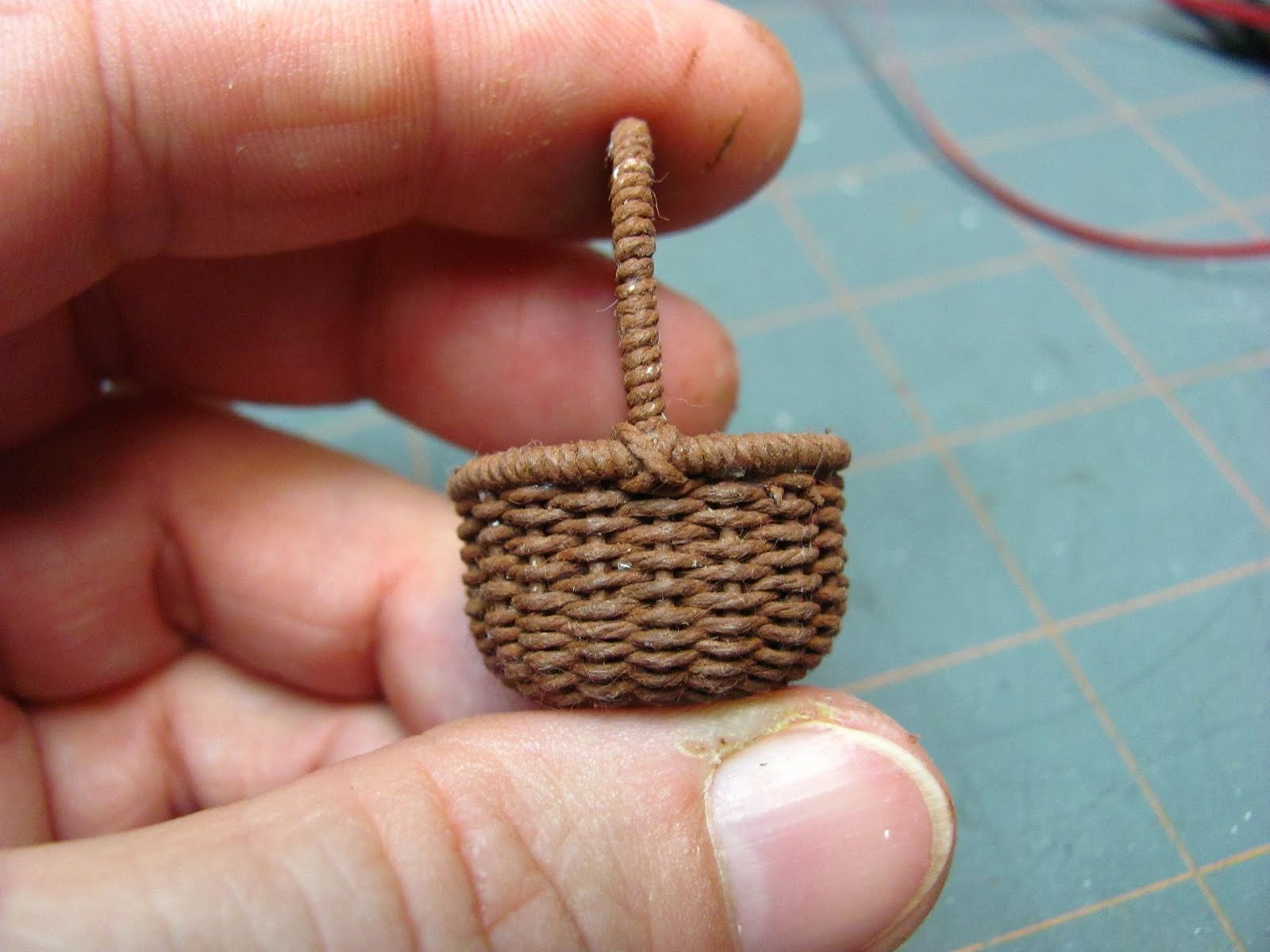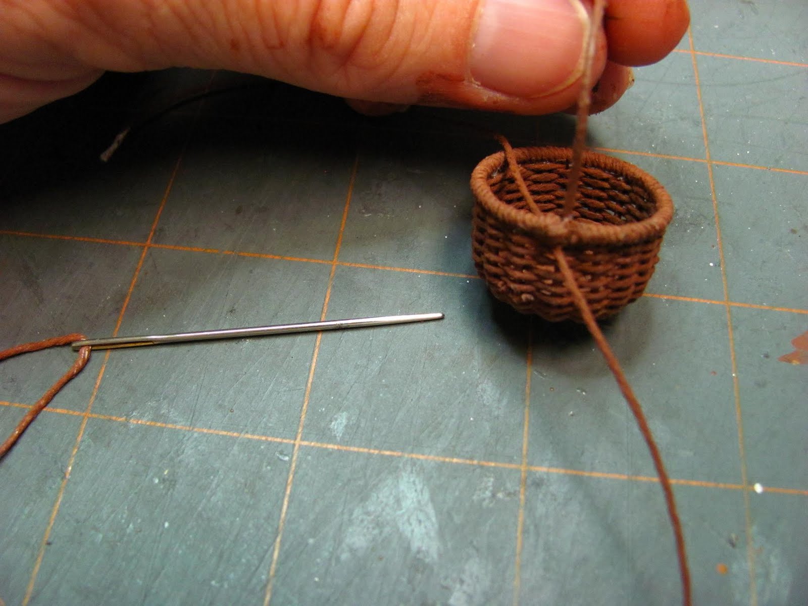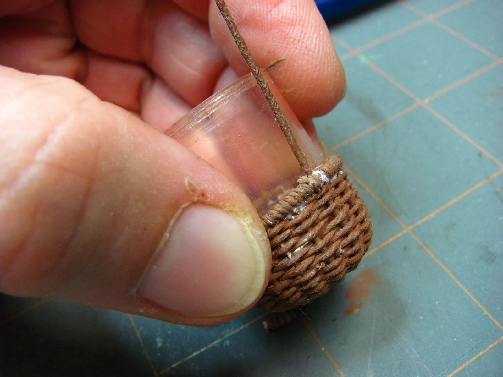 Этот учебник появился, когда я спросил о потоке я использовал, когда я сделал лейки. Это нить вязания крючком, пальто и Кларк, Classic. Миниатюрист хотел плести корзины с ним.