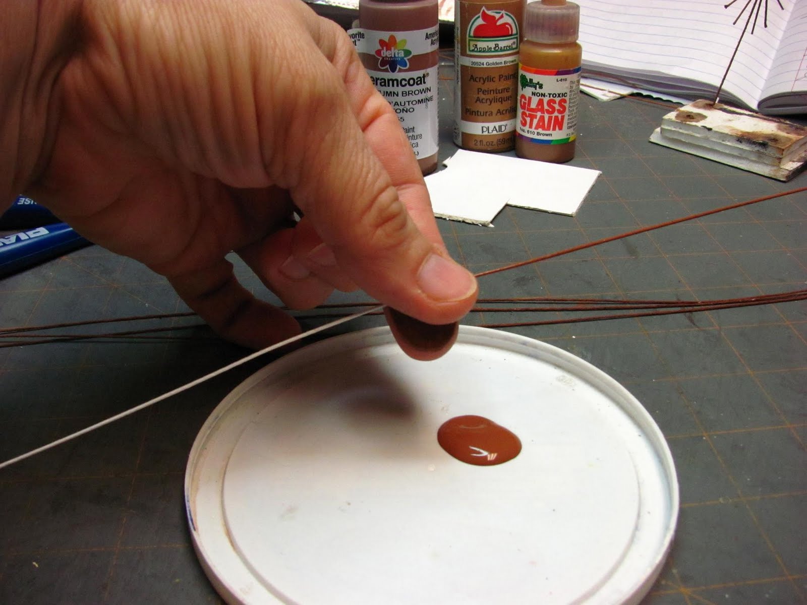 Там мой шар крючком нить с Ceramcoat осень Delta Брауна и Golden Apple ствола Брауна. Я использовал то, что у меня на руках. Коричневого стекла пятно используется для покрытия корзины после того как они закончили, это просто вариант.