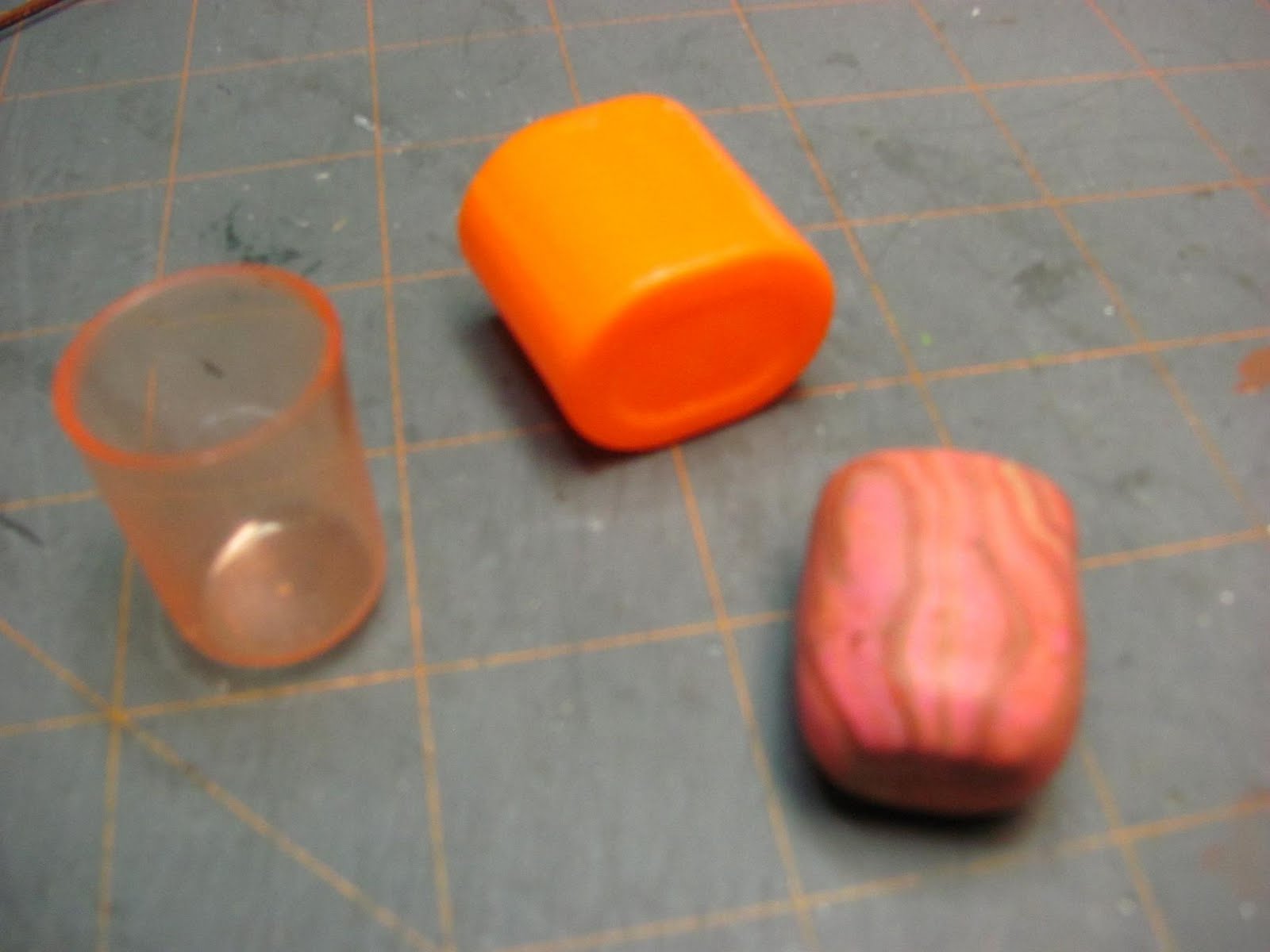 Следующее, что нужно сделать, это найти форму. Те, которые я использовал для этого проекта колпачок с моей бутылки лака для волос, я обрежьте нижнюю часть шт контейнер конфет Reese, и я сделал слепок с обрывки Фимо.