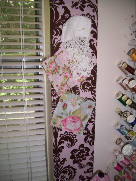 Эти  узорчатые розовые панели - обитый тканью пенопласт, в который идеально втыкаются иголочки с образцами, кусочками ткани и прочие мелочи.  Ну кто бы додумался?!