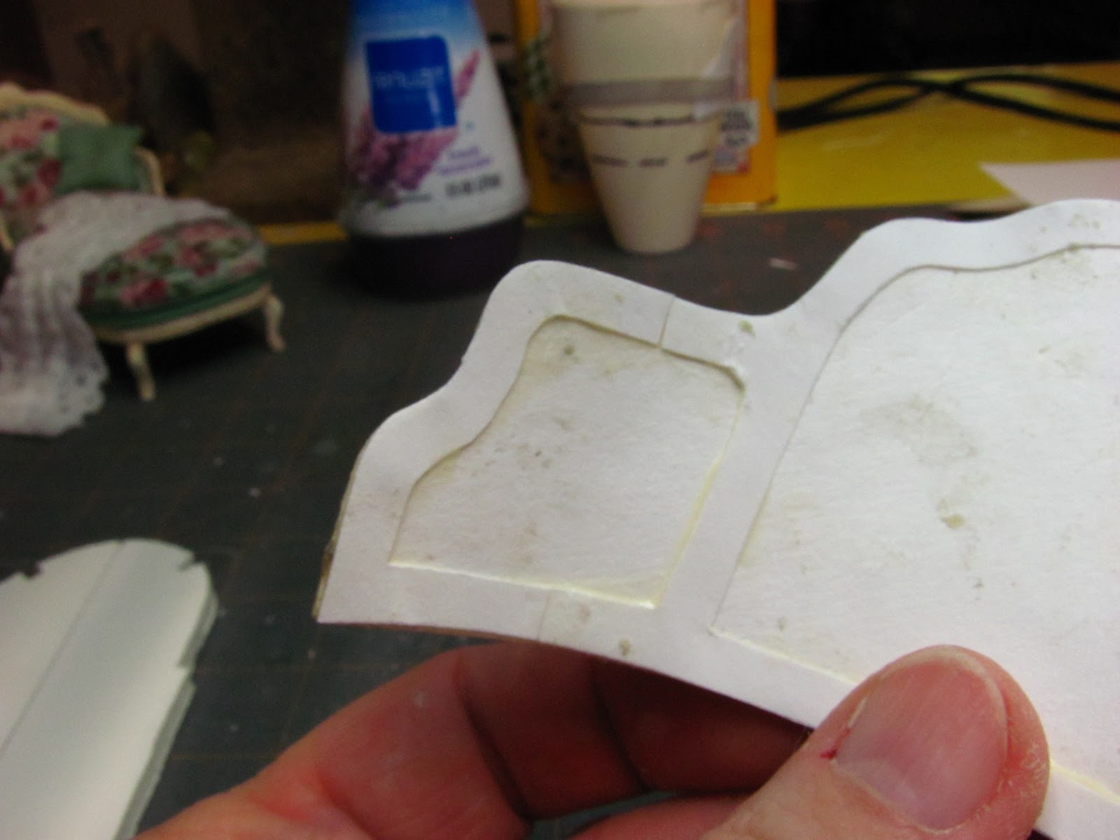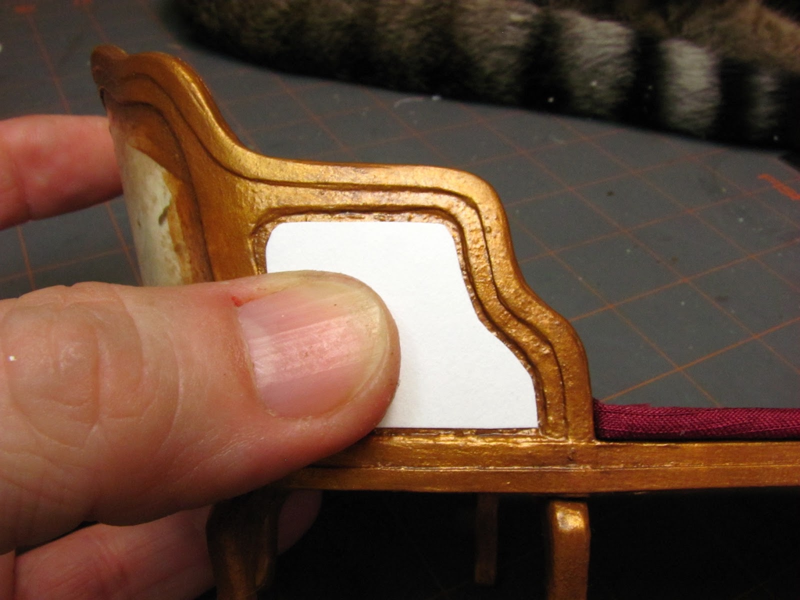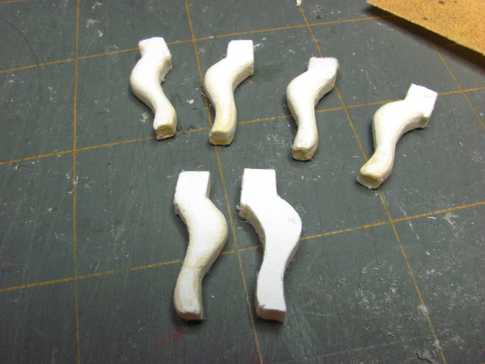 Yes, this is tedious. Yes, you could use bass wood and you wouldn't have to worry about the mat board coming apart, but you would also have to have a scroll saw. Wooden cabriole legs are available from Hobby Builders, on their on-line store, but they are too long to use. You would have to sand the sharp edges of off them, too. When these mat board legs are sanded, sealed and painted you can't tell that they aren't wood.