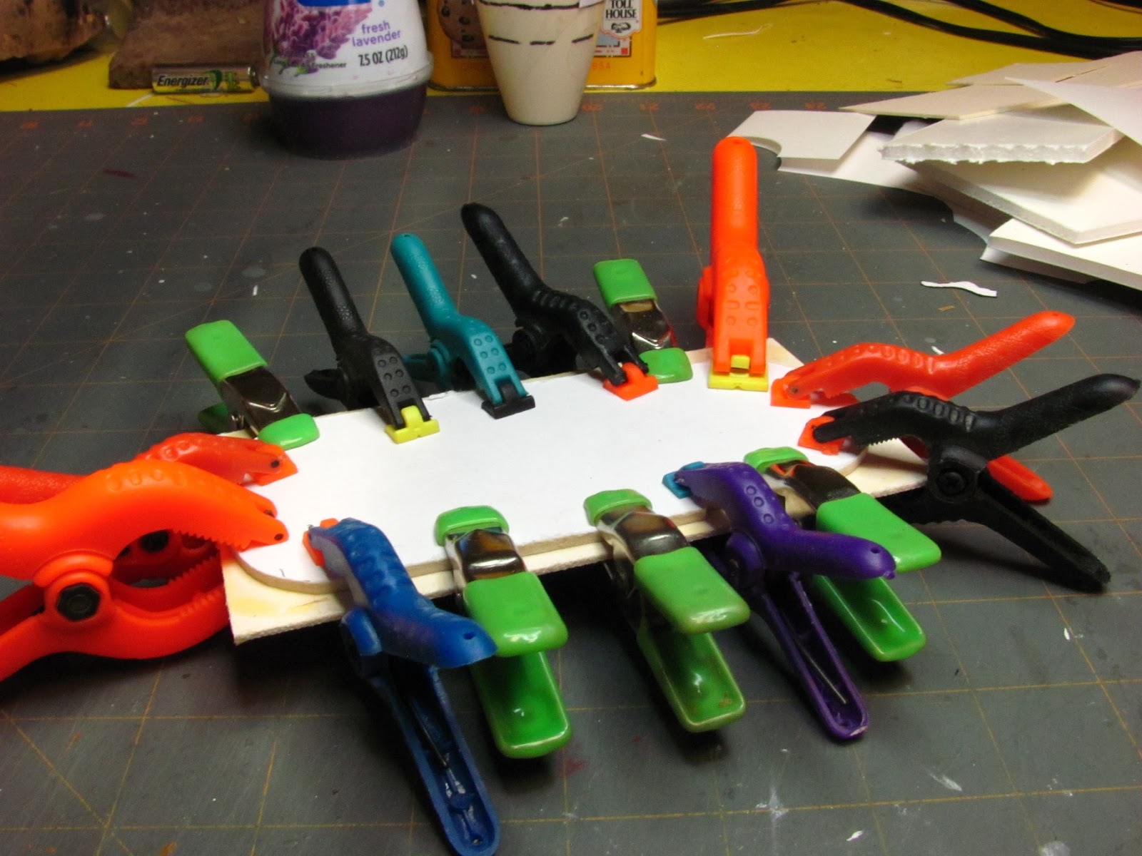 In this picture I have glued, using wood glue, three pieces of mat board together and have it clamped to dry. This is for the legs, I am going to use my scroll saw to cut out the six legs. Six legs are an option, you may want to just use 4. If you scroll down you find a picture showing the unfinished chaise with 4 legs. I like 6 so I am using 6.