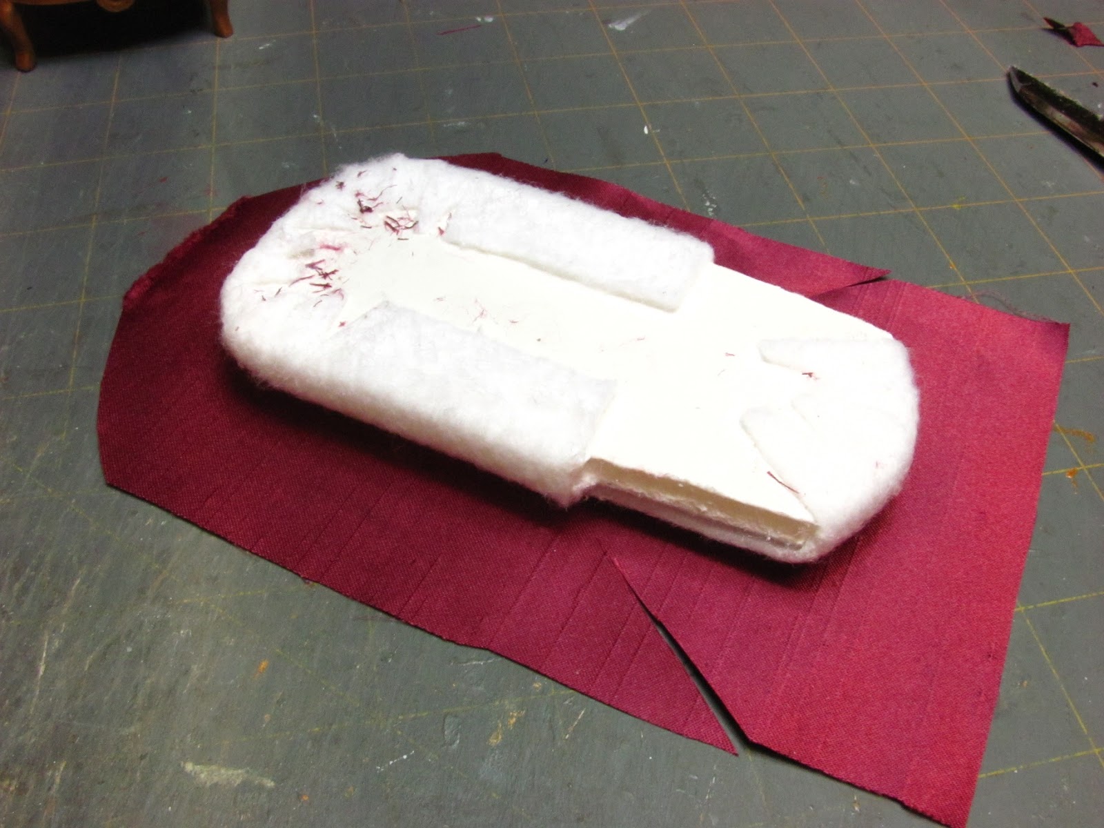 Cut a strip of Thermolam Plus, I talked about this in the "Make and upholster a 1 inch scale chair" tutorial. I buy it at JoAnn's, I have found it in the fabric department at Wal-Mart,too.