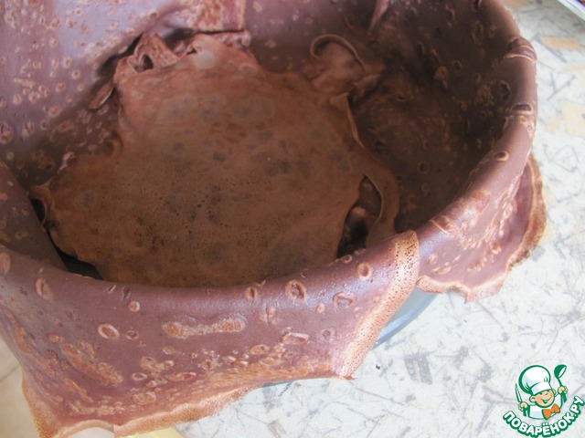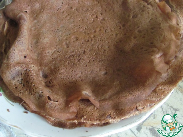 Какао просеять вместе с мукой. Хорошо смешать. Добавить сахар, желтки. Положить ваниль и соль. Постепенно влить молоко. Размешать венчиком или миксером, чтобы не было комочков. Добавить масло. Оставить тесто на 15-20 минут, чтобы набухла клейковина. Испечь на сковороде тонкие блины. |