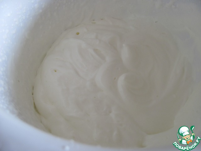 Холодные сливки взбить до пышности. Твердые пики нам не нужны. |