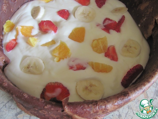 Сверху мешочков кладем оставшиеся фрукты и заливаем муссом. |