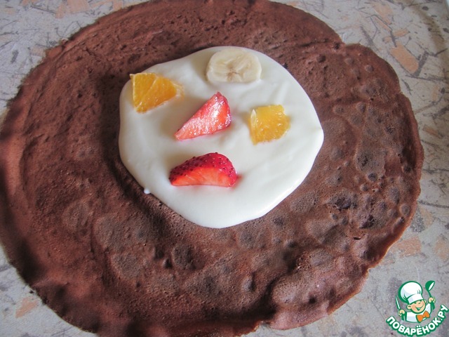 Подворачиваем блины на крем и в середину кладем оставшийся блин. Накрываем пленкой и ставим в холодильник на 5-6 часов. У меня стоял часов 10. Достаем, освобождаем от формы. Украшаем по своему желанию. Я украсила блином, взбитыми сливками и фруктами. Нарезаем и удивляем. |