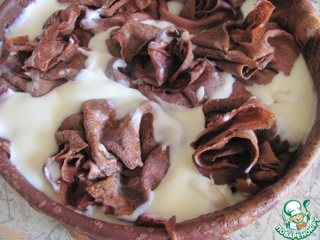 Укладываем мешочки в форму сверху на крем и слегка утапливаем. Так поступаем со всеми блинами, оставив один. |