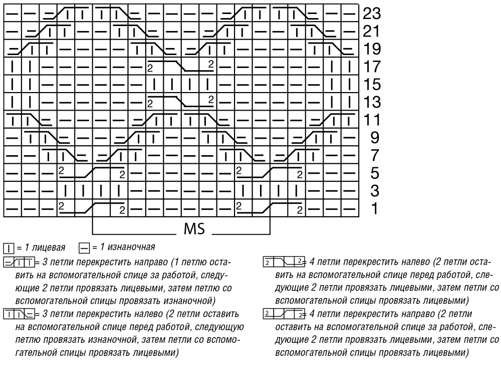 Число петель кратно 10 + 2 кромочные = вязать согл. схеме. На ней даны лицевые ряды. В изнаночных рядах петли провязывать по рисунку. Начать с 1 кромочной и петель перед раппортом, раппорт постоянно повторять, закончить петлями после раппорта и 1 кромочной. Постоянно повторять 1—24-й ряды.