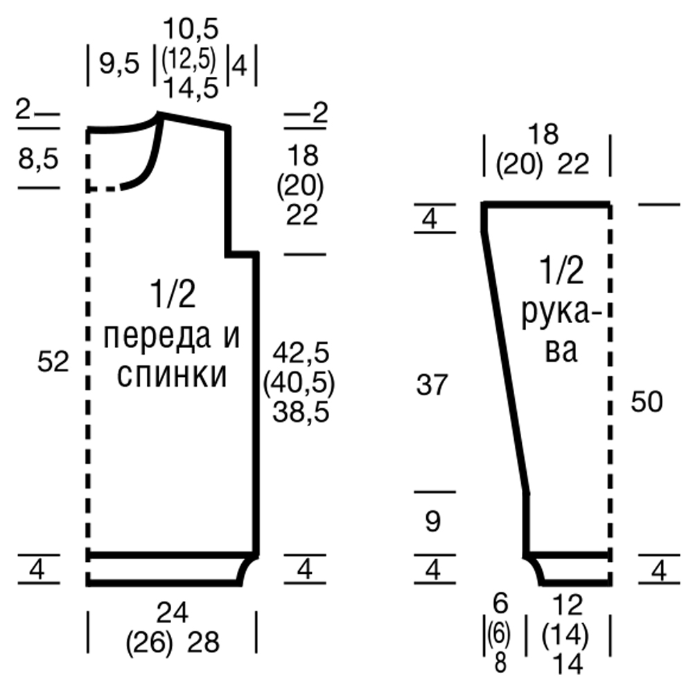 Для скоса рукава с обеих сторон прибавить через 9 см = 24 ряда от планки 1 x 1 п., затем в каждом 6-м ряду 14 x 1 п. (в каждом 6-м ряду 14 x 1 п.) в каждом 4-м ряду 19 x 1 п. согл. узору = 92 (102) 112 п.