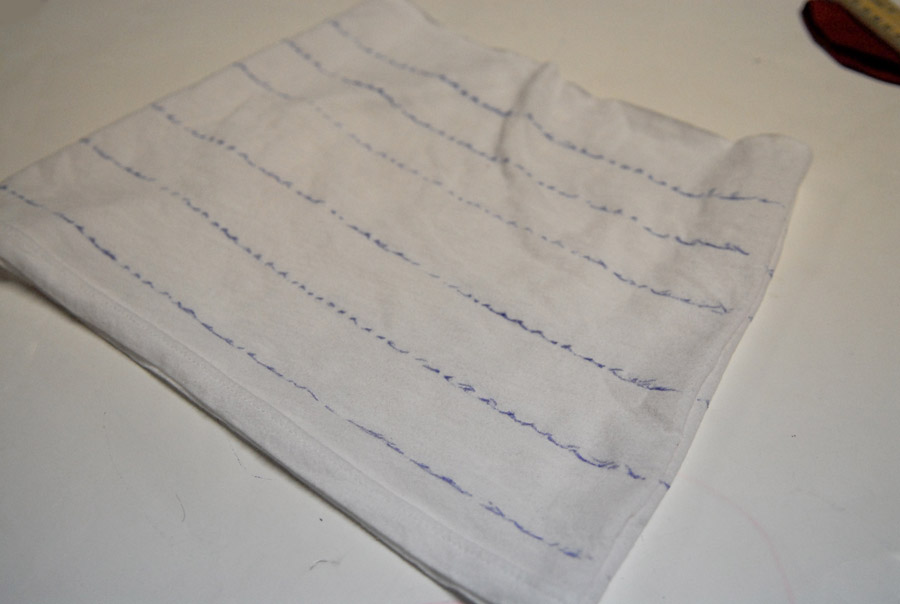Юбку сшить по бокам. Затем с помощью линейки начертить полосы.