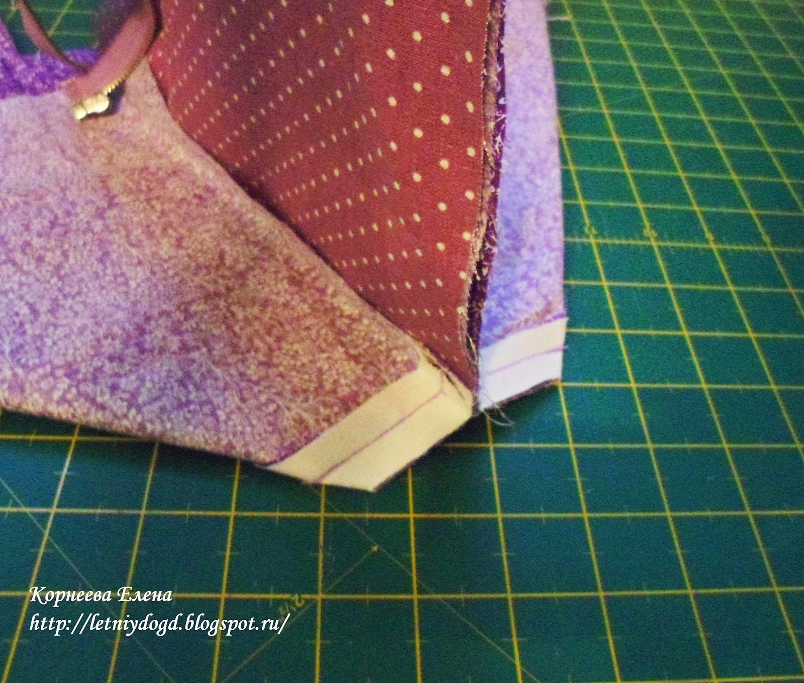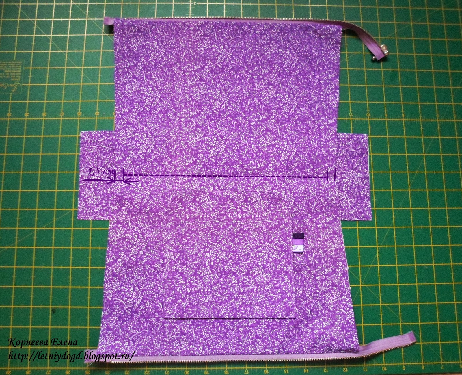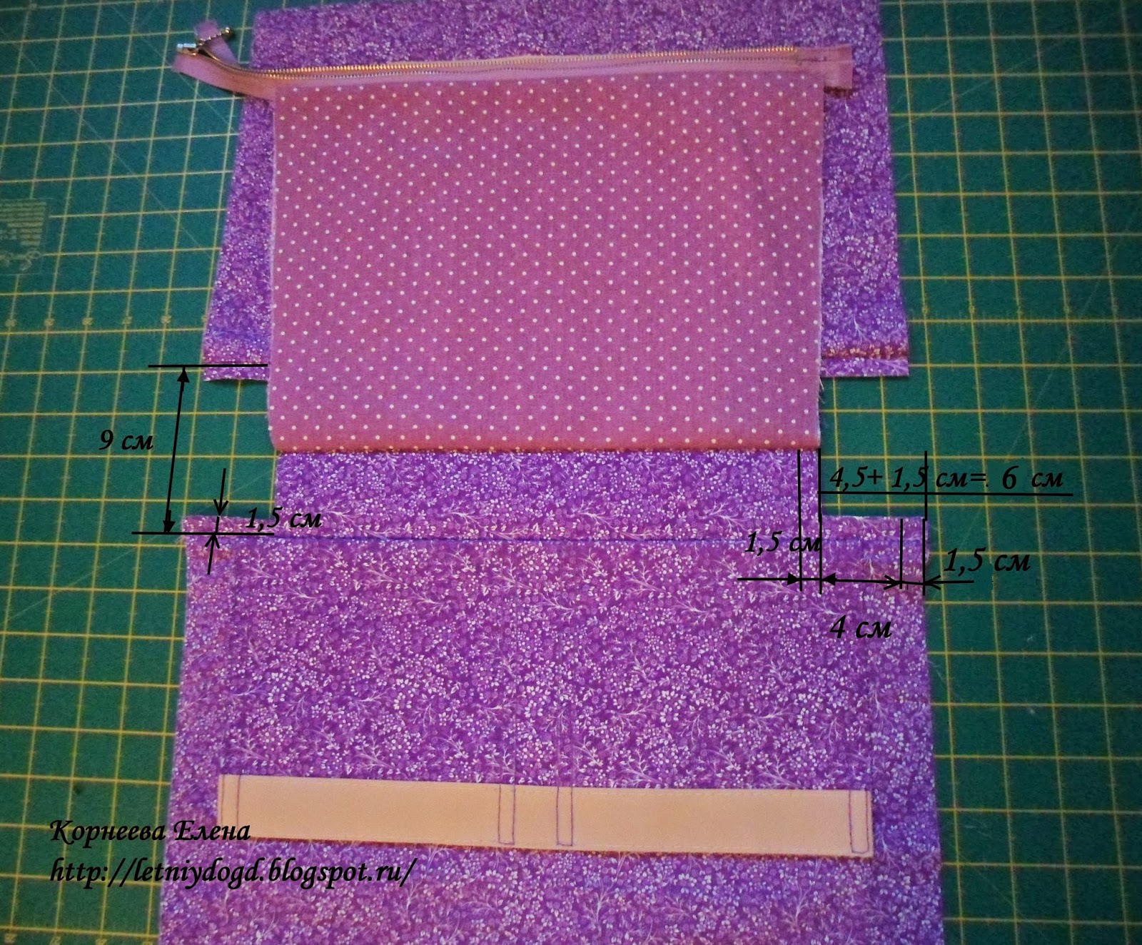 Слева на фото 1,5 см - это ширина шва. 9 см - ширина дна сумки в готовом виде.