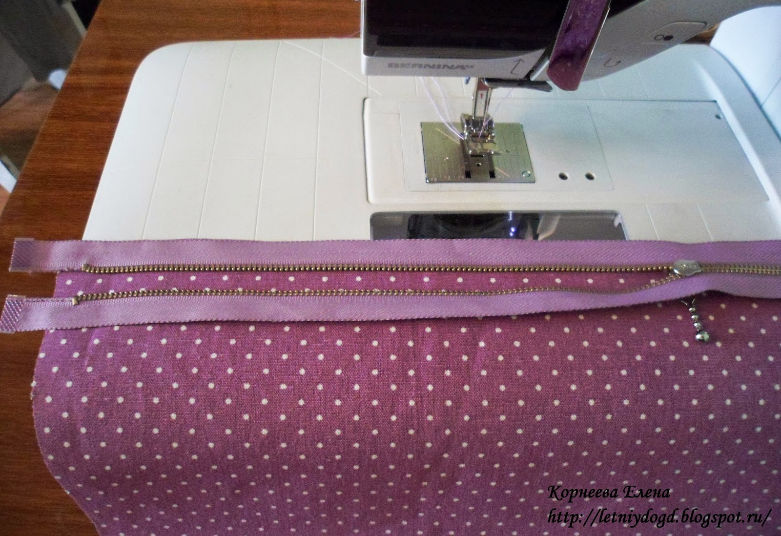 1) Кладем молнию лицом вниз на лицевую сторону детали А, наметываем или скалываем, кто как привык, пристрачиваем: