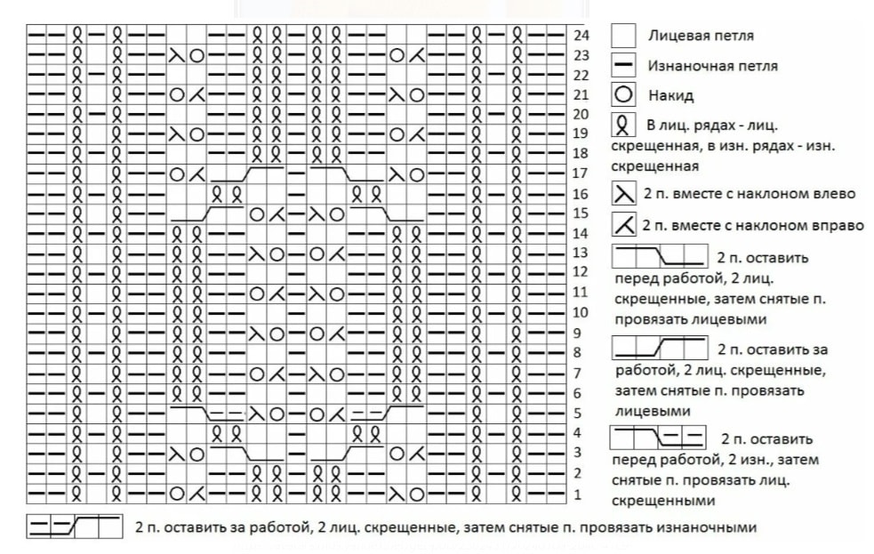 Раппорт узора состоит из 23 петель + 2 кромочные в ширину, и 24 рядов в высоту. На схеме приведены лицевые и изнаночные ряды.