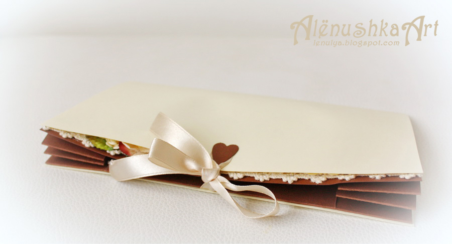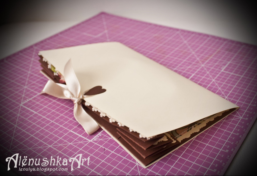 Украшаем на свой вкус и приклеиваем обложку, к которой уже должны быть приклеены ленточки, если нужно чтобы открытку можно было завязывать