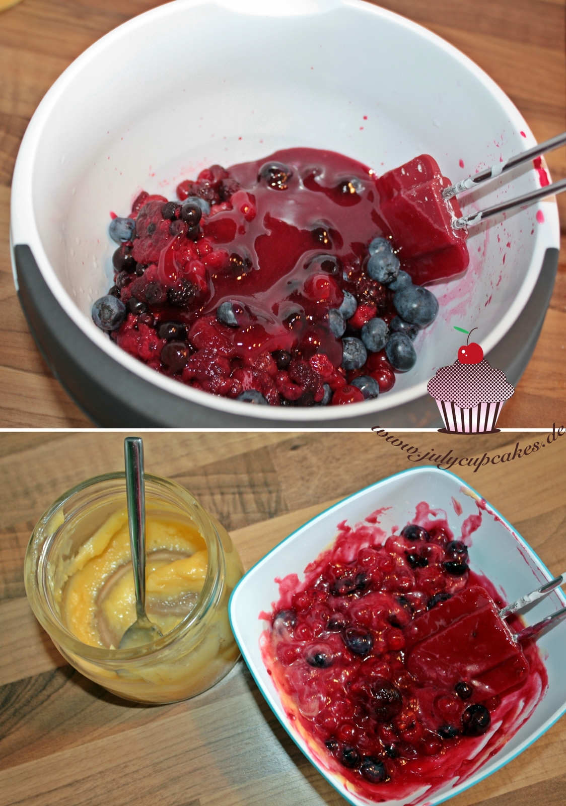4 с.л. ягоды разминаем вилкой, добавляем немного сока (какой есть), добавляем сахар и ставим в кастрюльке нагревать. Крахмал разводим в небольшом количестве сока, растираем ложкой, пока масса не станет однородной и без комков. Вводим в нагретую массу из ягод, сахара и сока. Нагреваем до загустения, хорошо мешая. Снимаем кастрюльку с огня. Добавляем оставшиеся ягоды, хорошо перемешиваем и даём остынуть в течении 10 минут. Добавляем 4-5 с.л. лимонного крема (Lemon Curd), перемешиваем. Начинка готова.