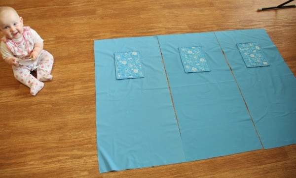Намечаю и пришиваю кармашки. Ребенок смирно сидящий только проснулся, поэтому не успел кинуться нарушать конструкцию, в обычное время такой номер бы не прошел.